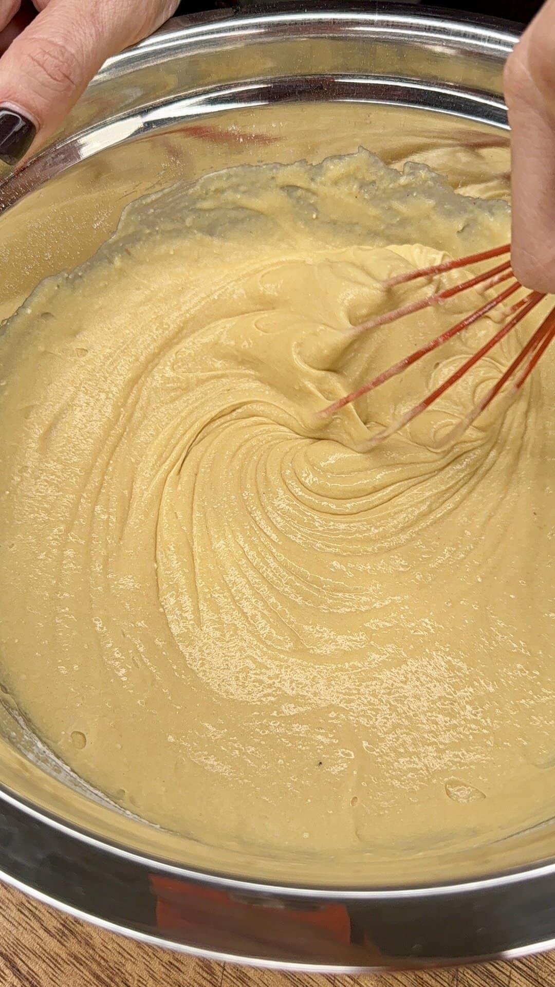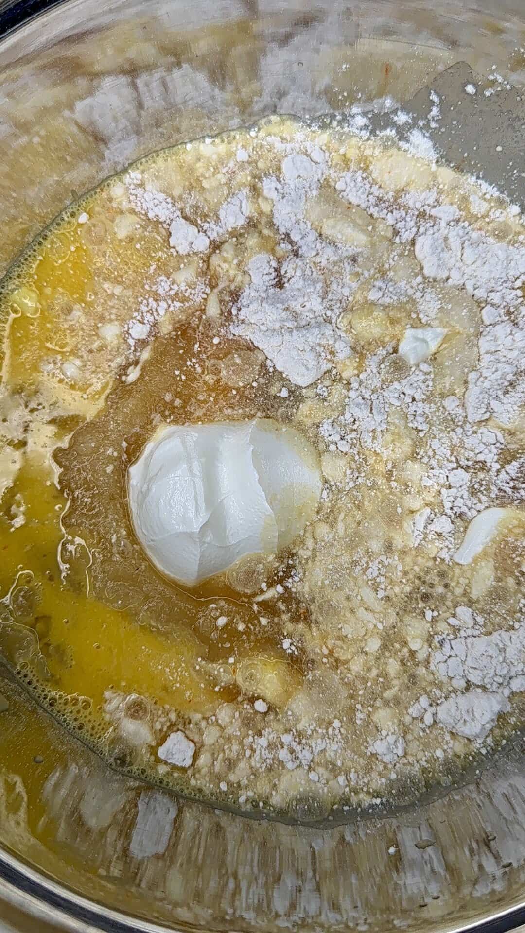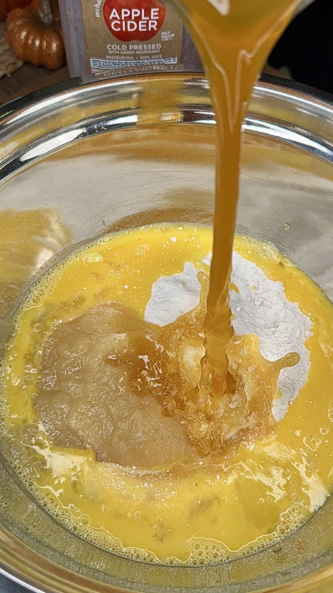 - In a large bowl, whisk together cake mix, apple cider, applesauce, sour cream, eggs, melted butter, and vanilla until smooth.