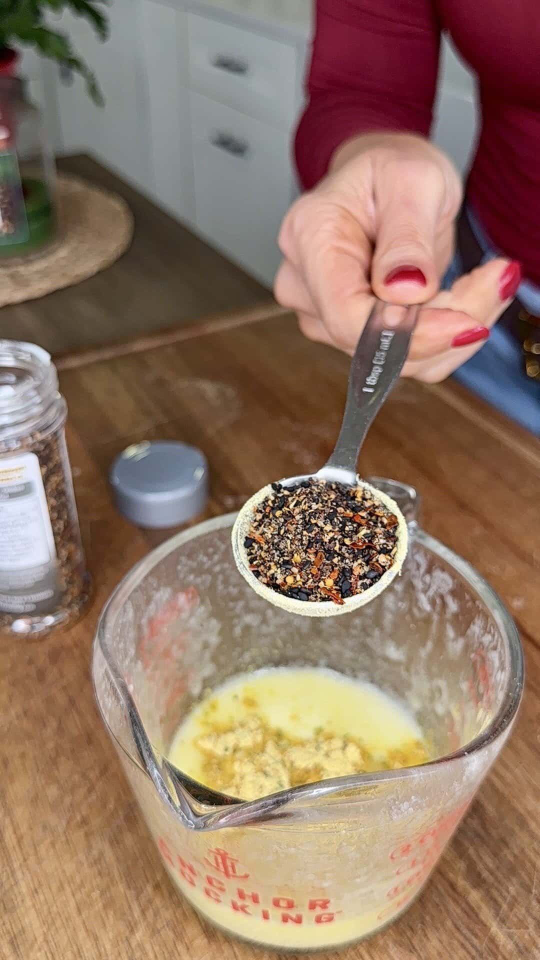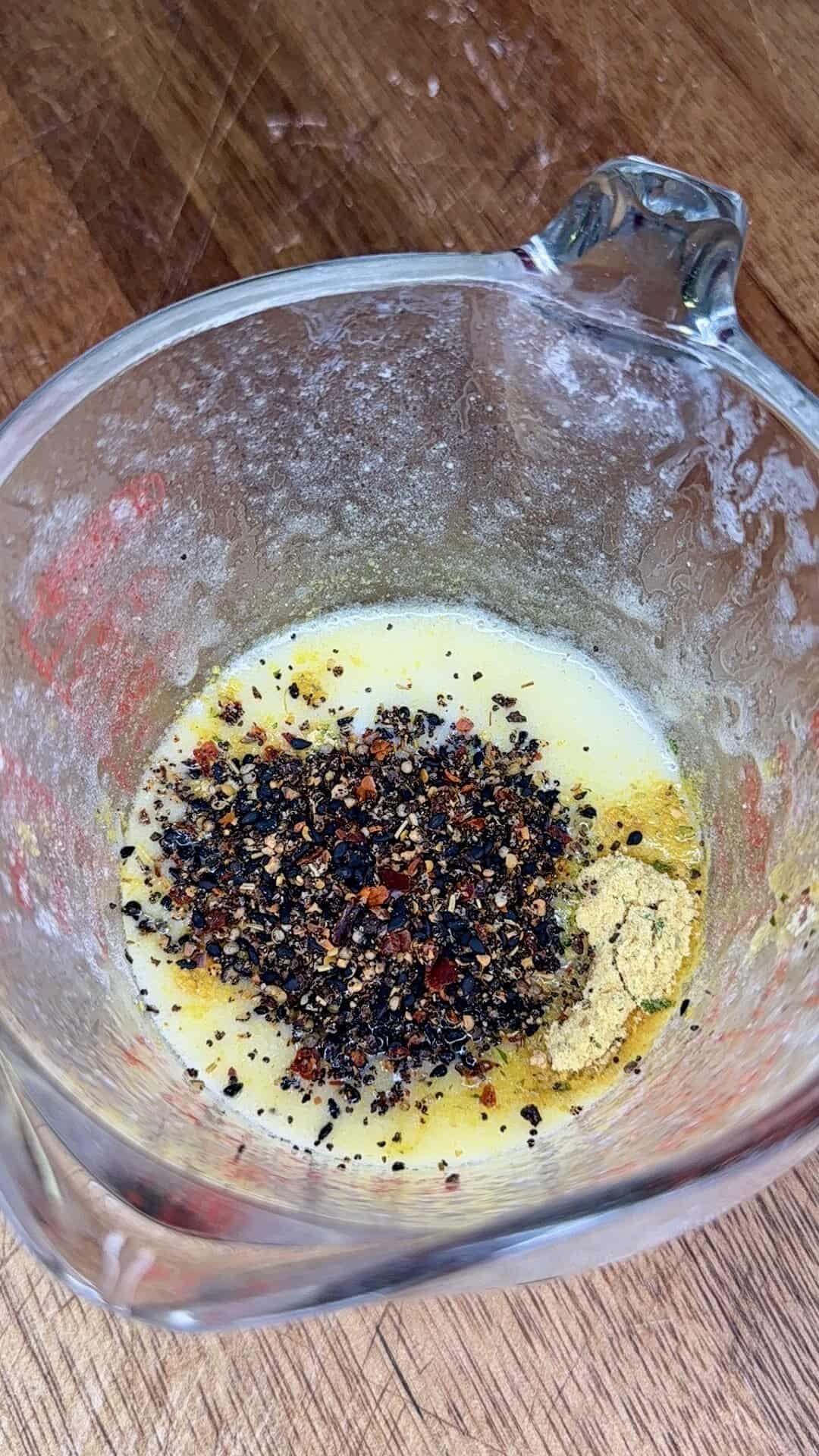 - Add a small splash of olive oil to the measuring cup that had the butter mixture.