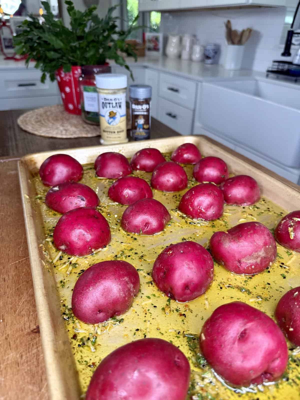 - 3 pounds red potatoes sliced in half lengthwise