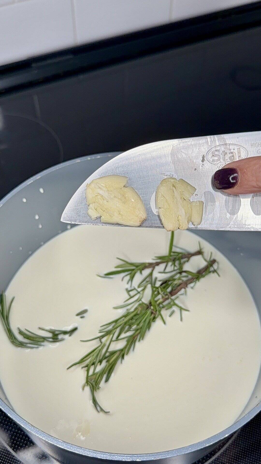 - In a medium saucepan, combine chicken stock + heavy cream.