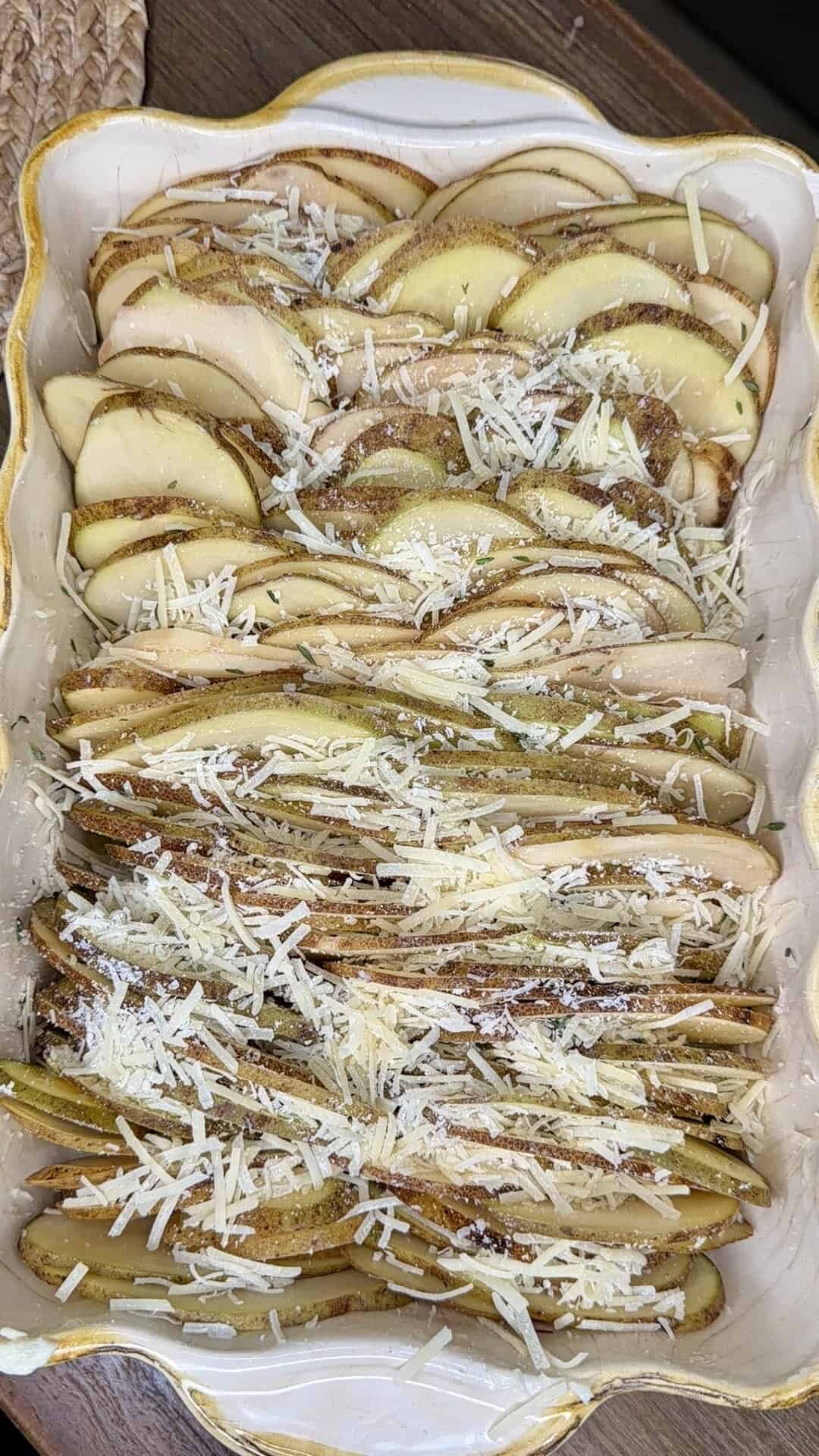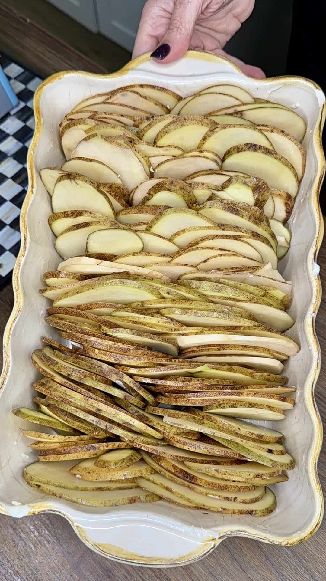 - Add all sliced potatoes to the baking dish in a rustic, loosely stacked pattern.