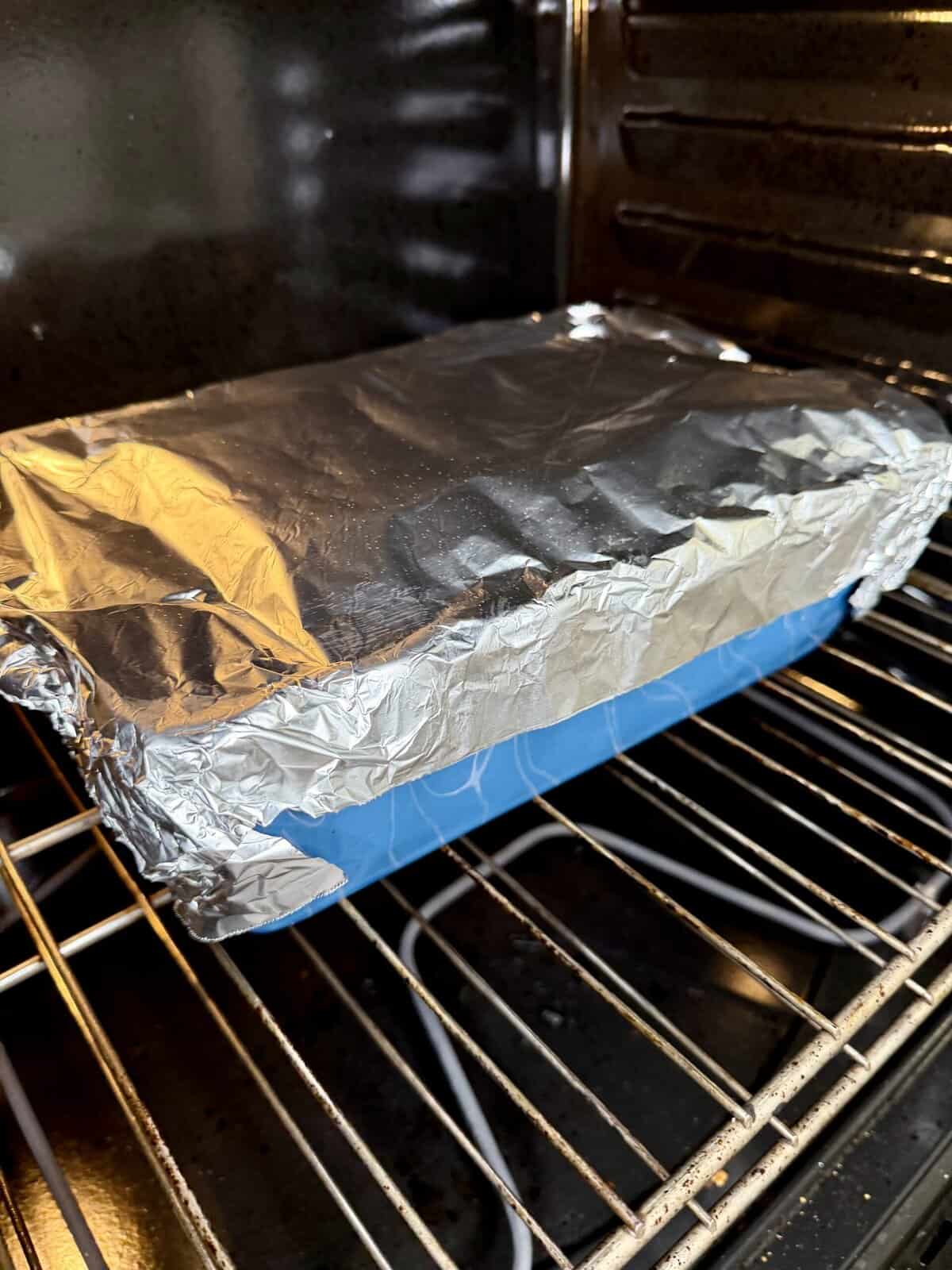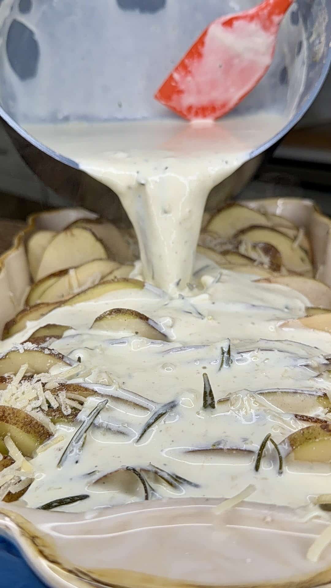 - Shake the dish slightly so the sauce settles between all the potatoes.