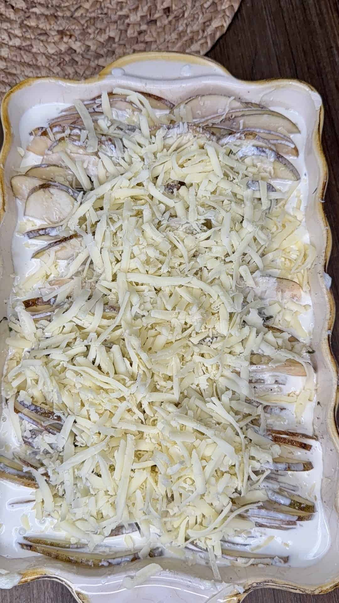 - Sprinkle ½ cup grated Parmesan over the potatoes, pushing some cheese gently down between the layers.
