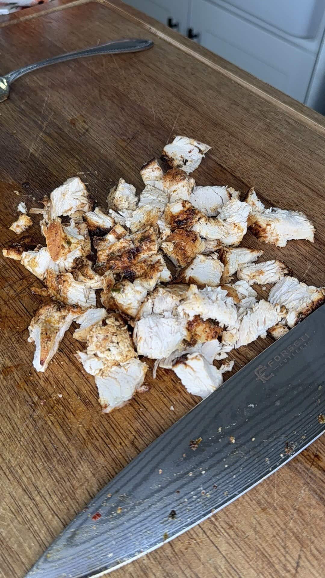 - Dice one breast into ½-inch pieces; slice the other for topping.