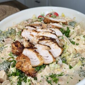 - Top with the sliced chicken. Garnish with fresh parsley, a sprinkle of dried chives, and extra lemon zest or red pepper flakes if you want a little kick.