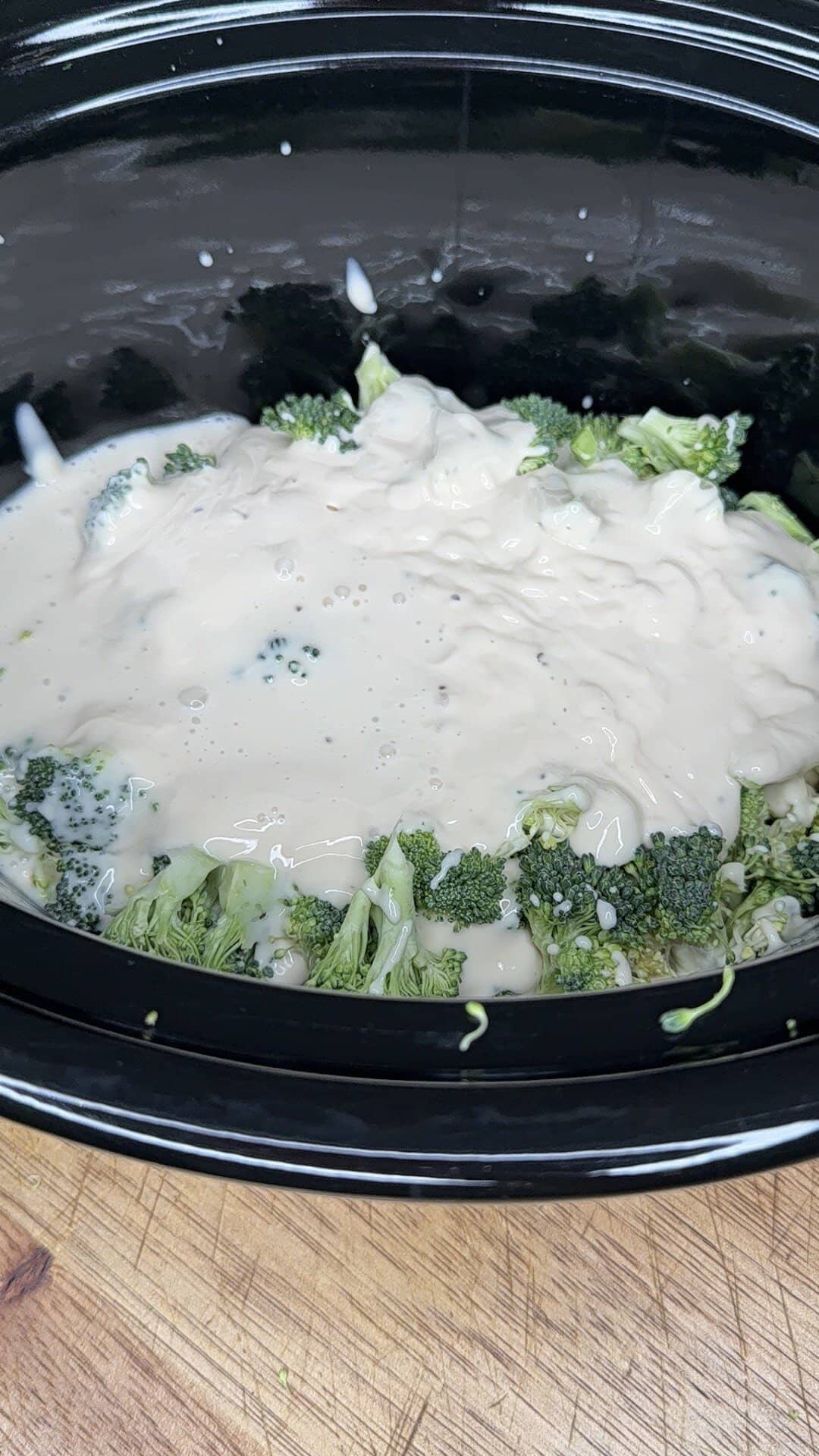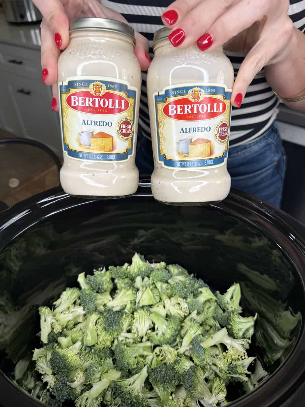 - Add Alfredo sauce, the shaken-jar stock, butter, minced garlic (4 cloves), 1 tablespoon seasoning, lemon zest, lemon juice, 1 teaspoon Dijon, and the chopped broccoli to the Crock-Pot. Stir well.