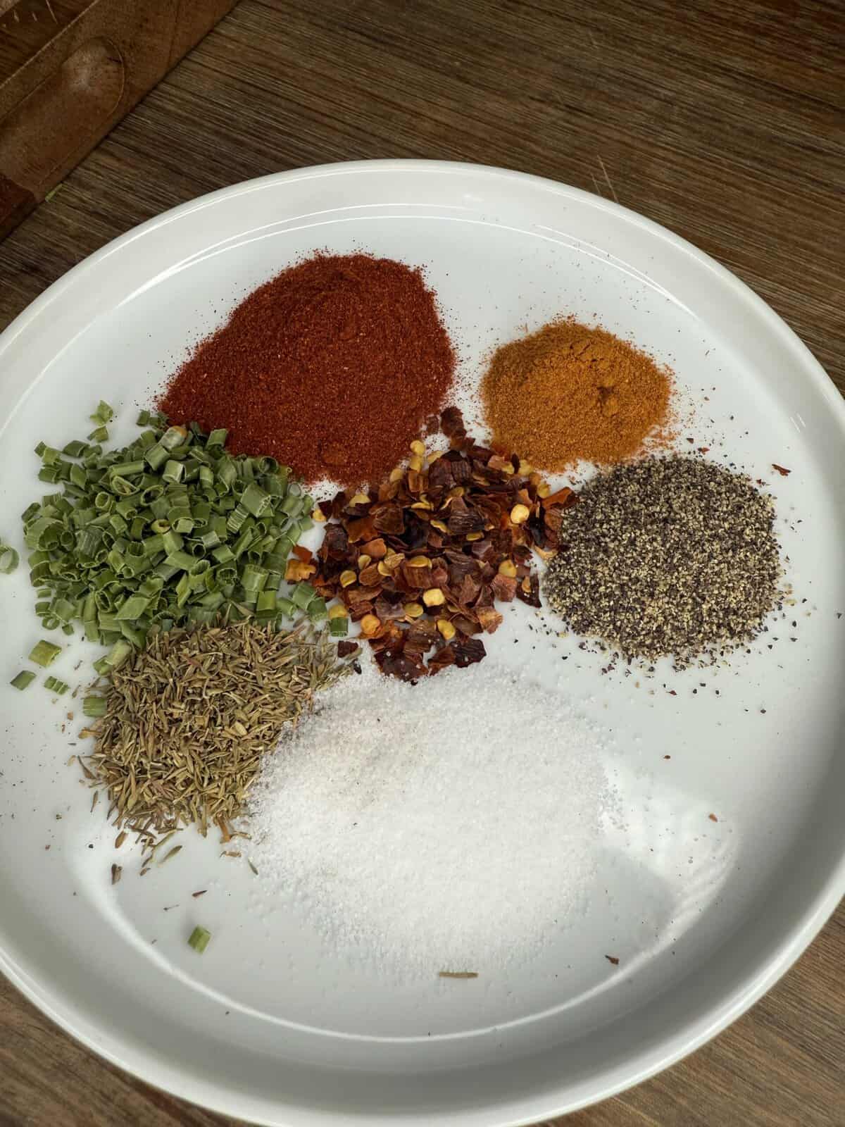 - Mix paprika, cayenne, dried chives, dried thyme, red pepper flakes, black pepper, and salt.