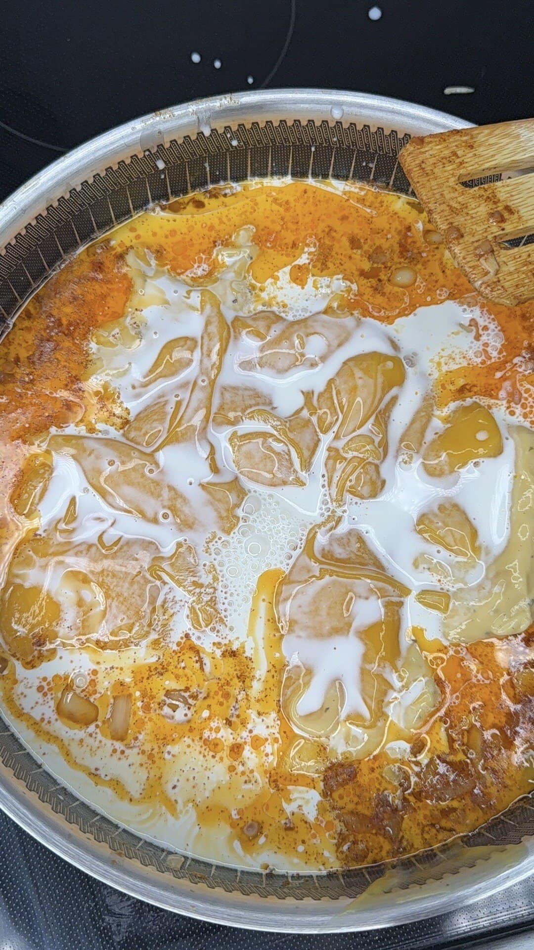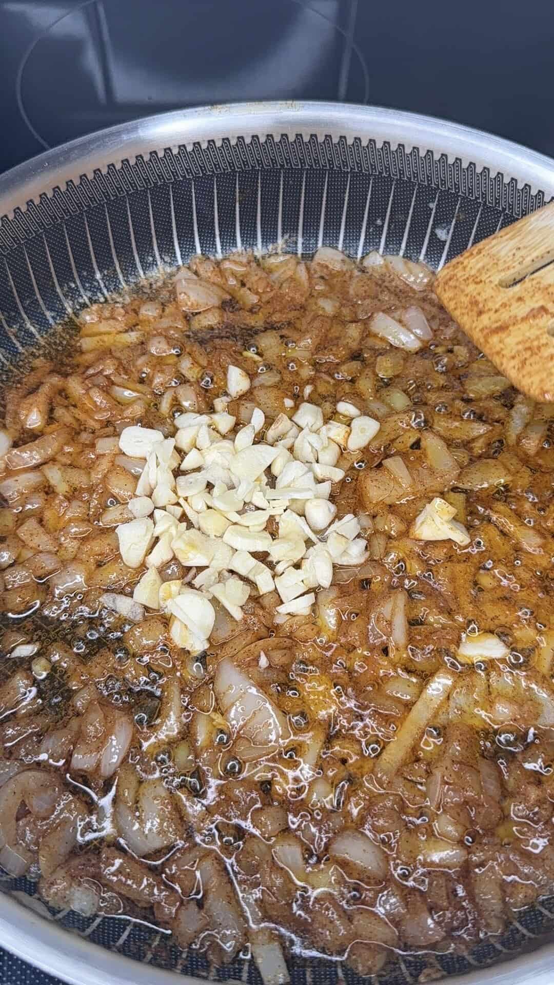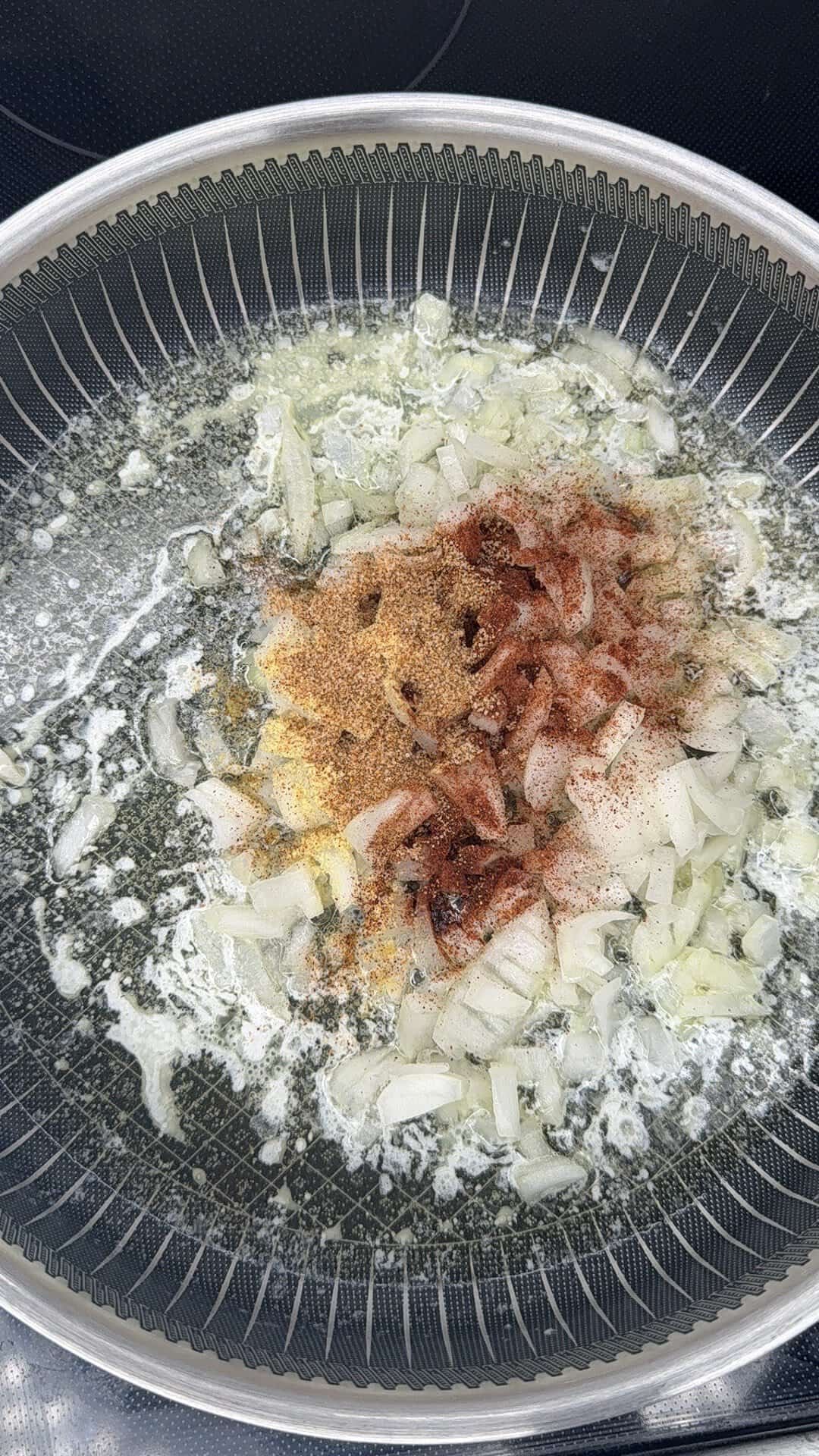 - Stir in garlic, then immediately add seasonings — Tony’s Creole, mustard powder, smoked paprika, salt, and pepper — and cook until fragrant.