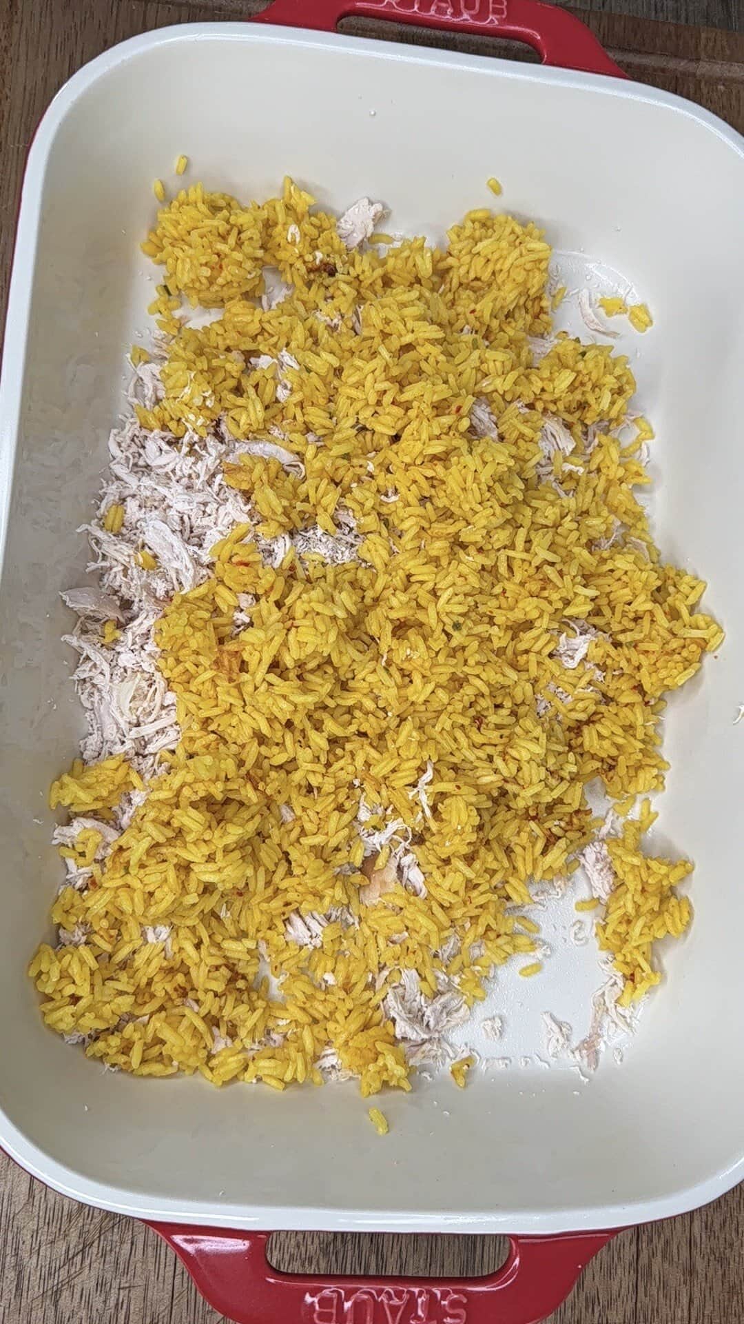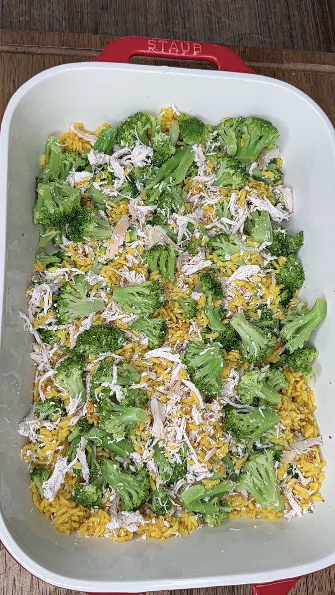 - In the prepared casserole dish, add shredded chicken, broccoli, and cooked yellow rice. Mix together directly in the dish.