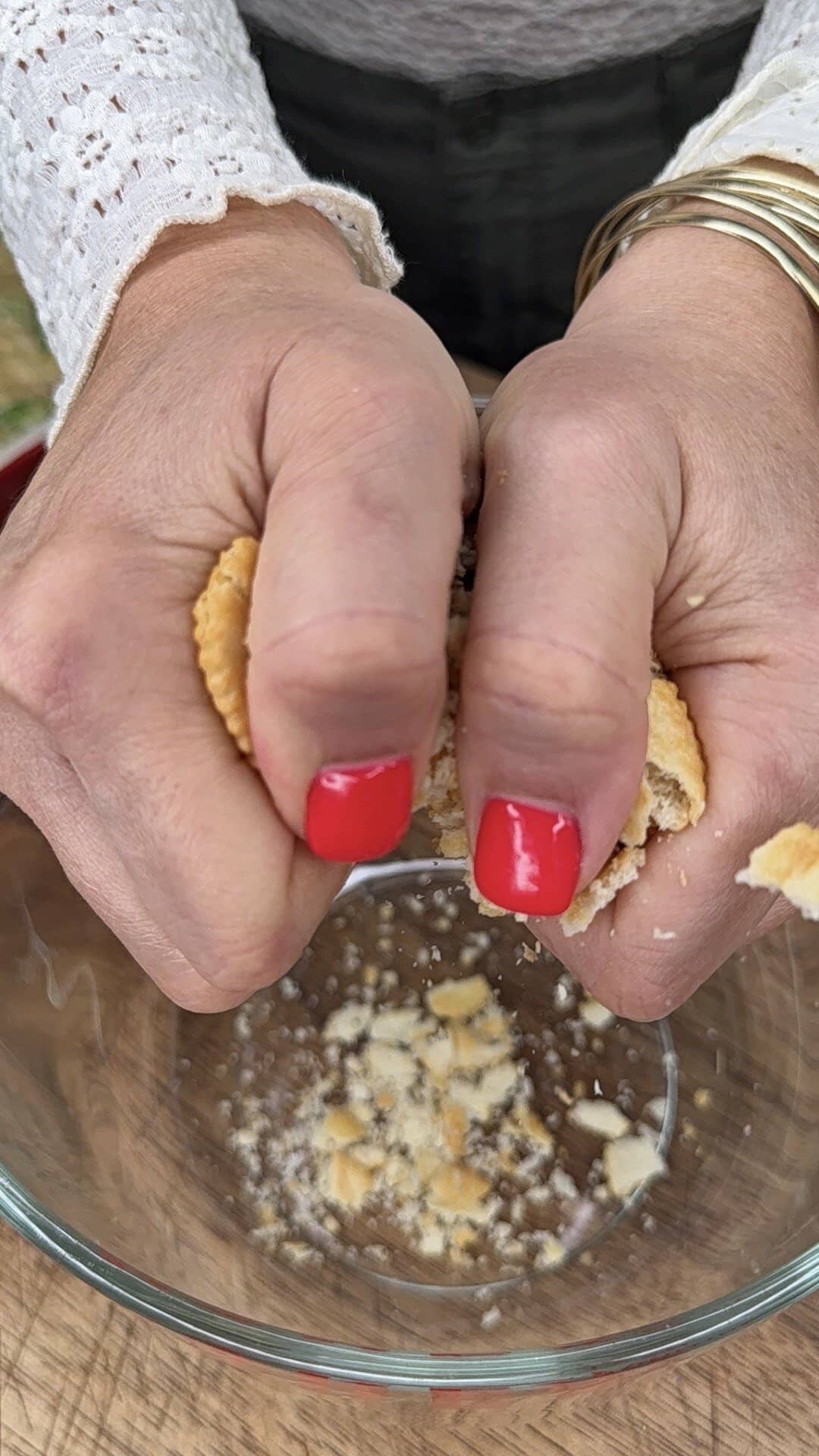 - Mix 28 crushed Ritz crackers with 3 Tbsp melted butter and a little fresh parsley. Sprinkle over the top.
