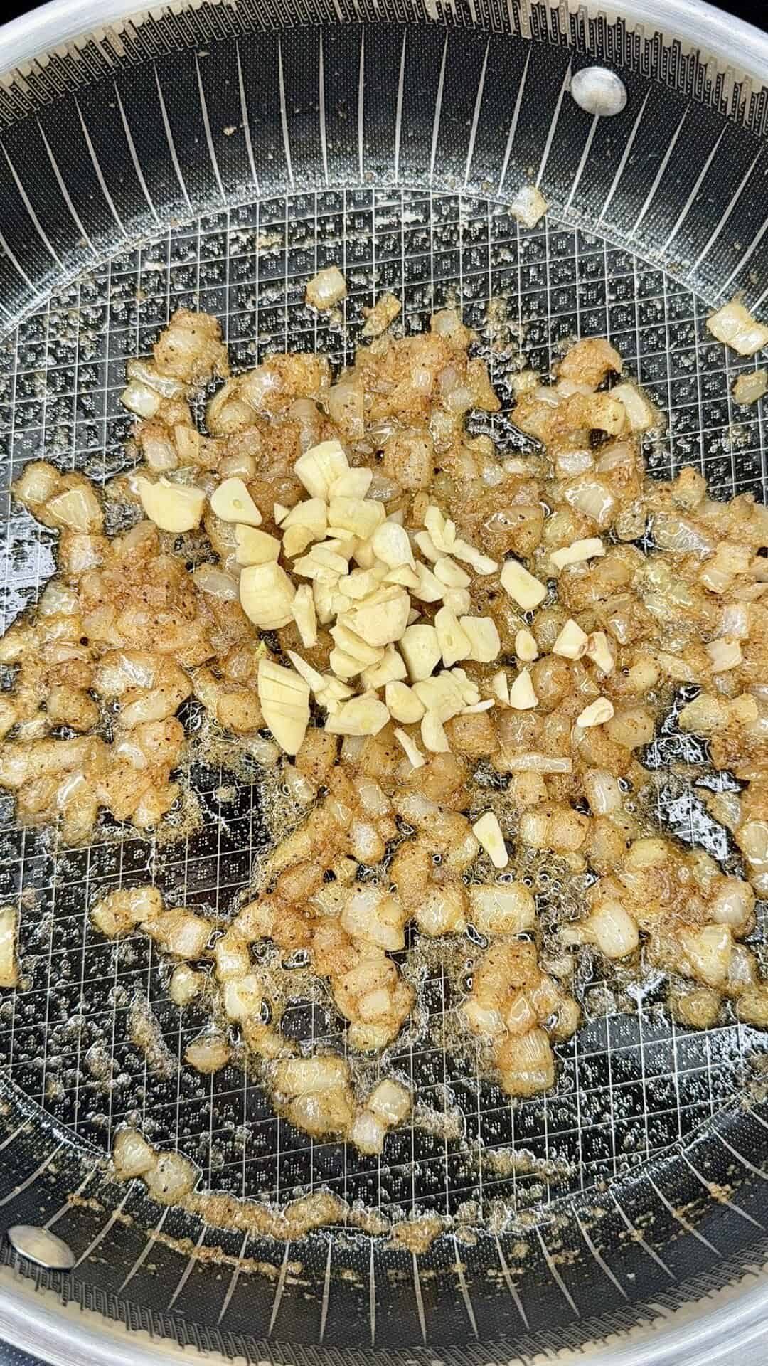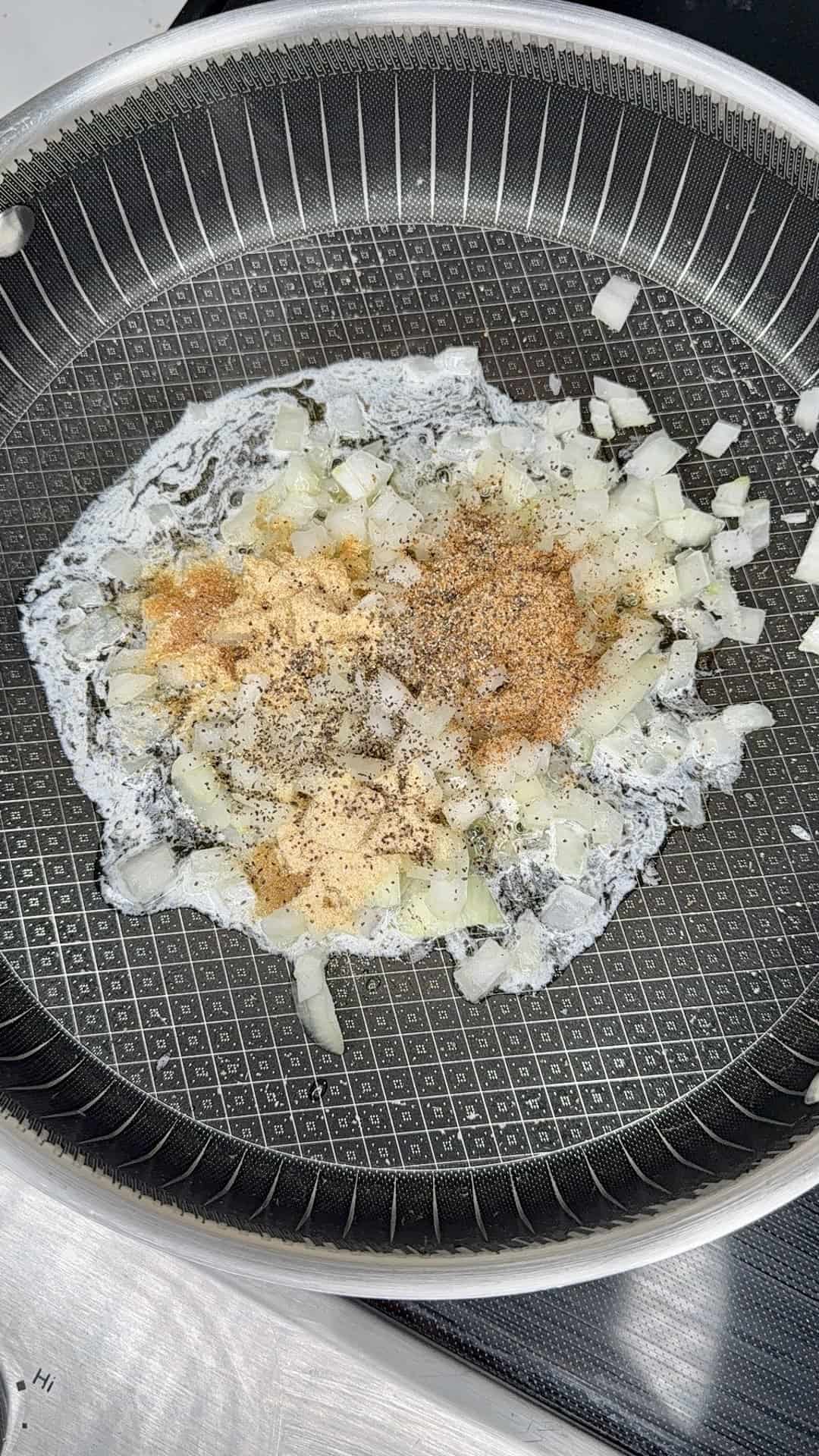 - In a skillet or Dutch oven, melt butter and sauté onion with all the seasonings (Tony’s, garlic powder, onion powder, salt & pepper) until onion is translucent, about 5–7 minutes. Add garlic, cook 1 more minute.