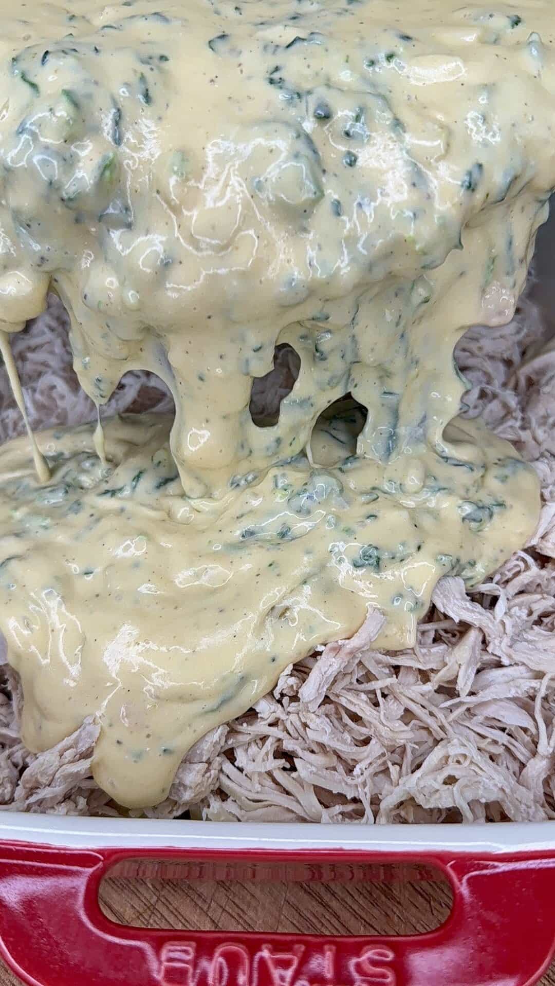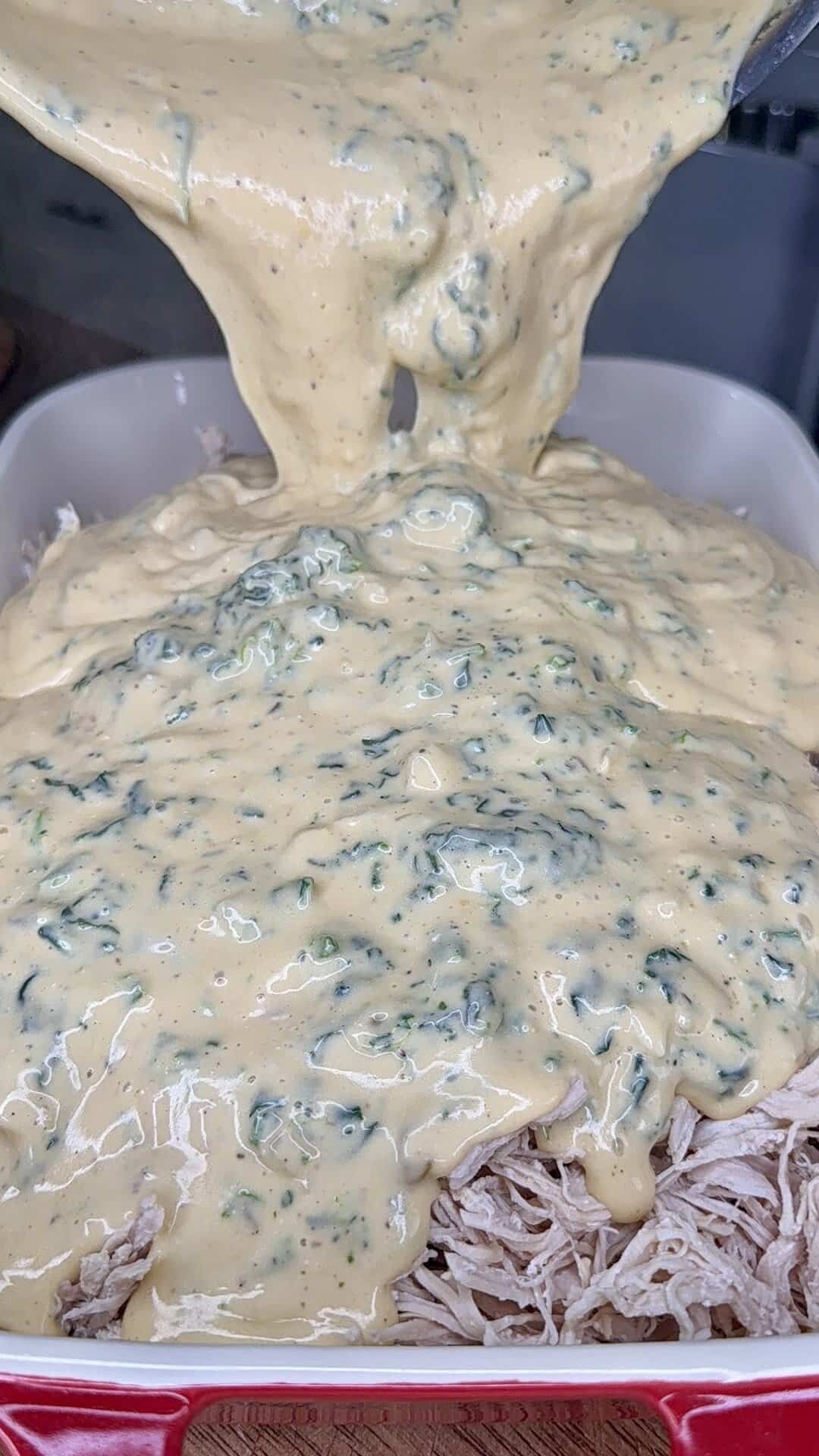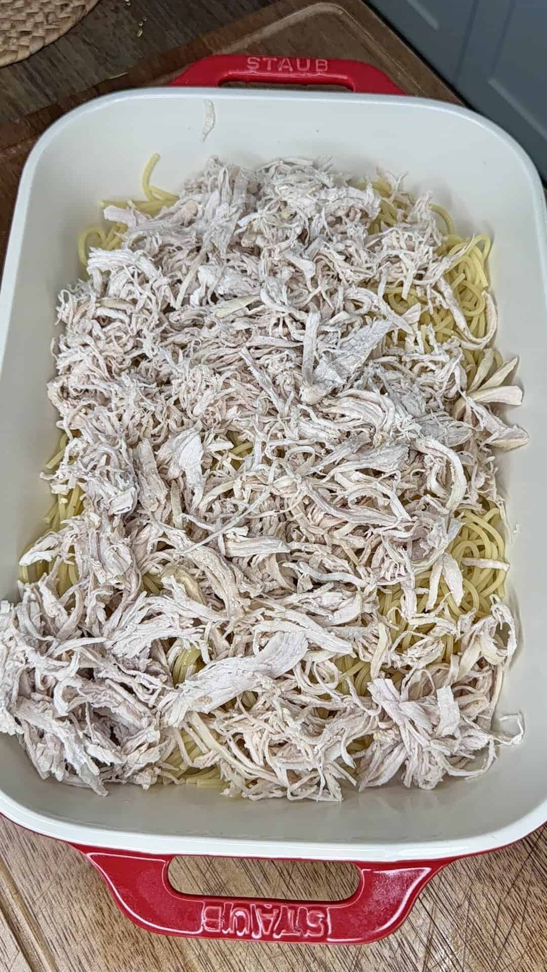 - Add cooked spaghetti noodles first, spreading evenly. Top with shredded chicken. Pour the sauce over everything and gently toss in the baking dish until noodles are fully coated.