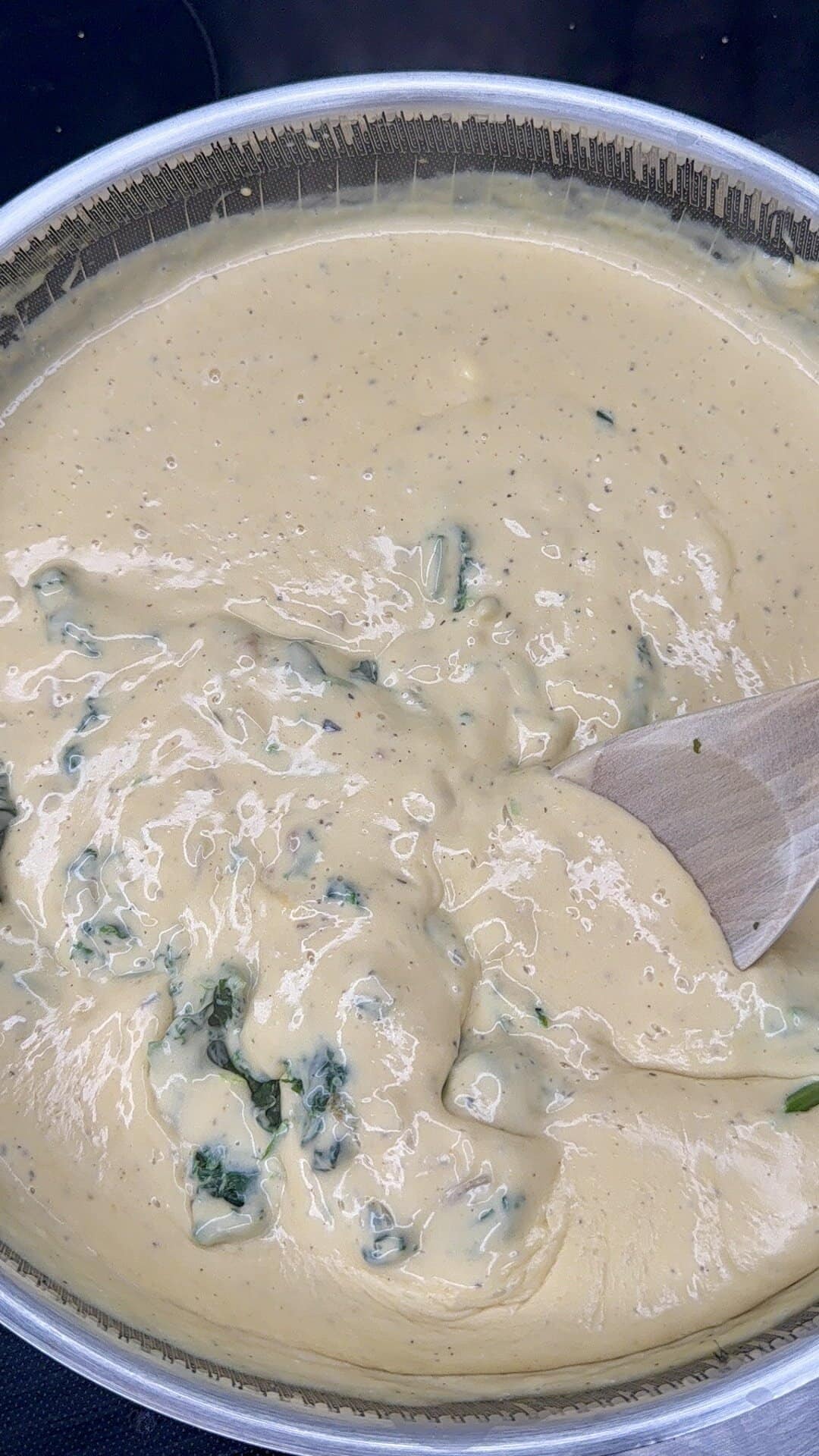 - Once everything is smooth, stir in sour cream, the thawed and squeezed spinach, and about half of the shredded Colby Jack cheese. Add more broth as needed until the sauce reaches a creamy, pourable consistency (about 1½ cups total usually works).