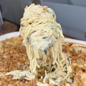 Get ready for your new favorite baked pasta! This Creamy Chicken Tetrazzini is rich, creamy, cheesy, and totally comforting — everything you want in a family-friendly casserole. We layer juicy chicken boiled in a flavorful bouillon broth, spaghetti cooked in that same broth for extra flavor, and a silky sauce made with Velveeta, sour cream, cream of chicken soup, and plenty of heavy cream. It all gets topped with Colby Jack, mozzarella, and a golden layer of crushed French fried onions for that irresistible crunch. If you love hearty, crowd-pleasing pasta bakes, you’ll want to check out some of my other viral hits too — like my Beefy Baked Ziti, Poor Man’s Casserole, and Million Dollar Spaghetti.