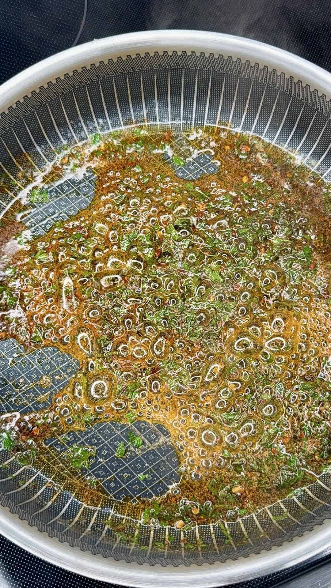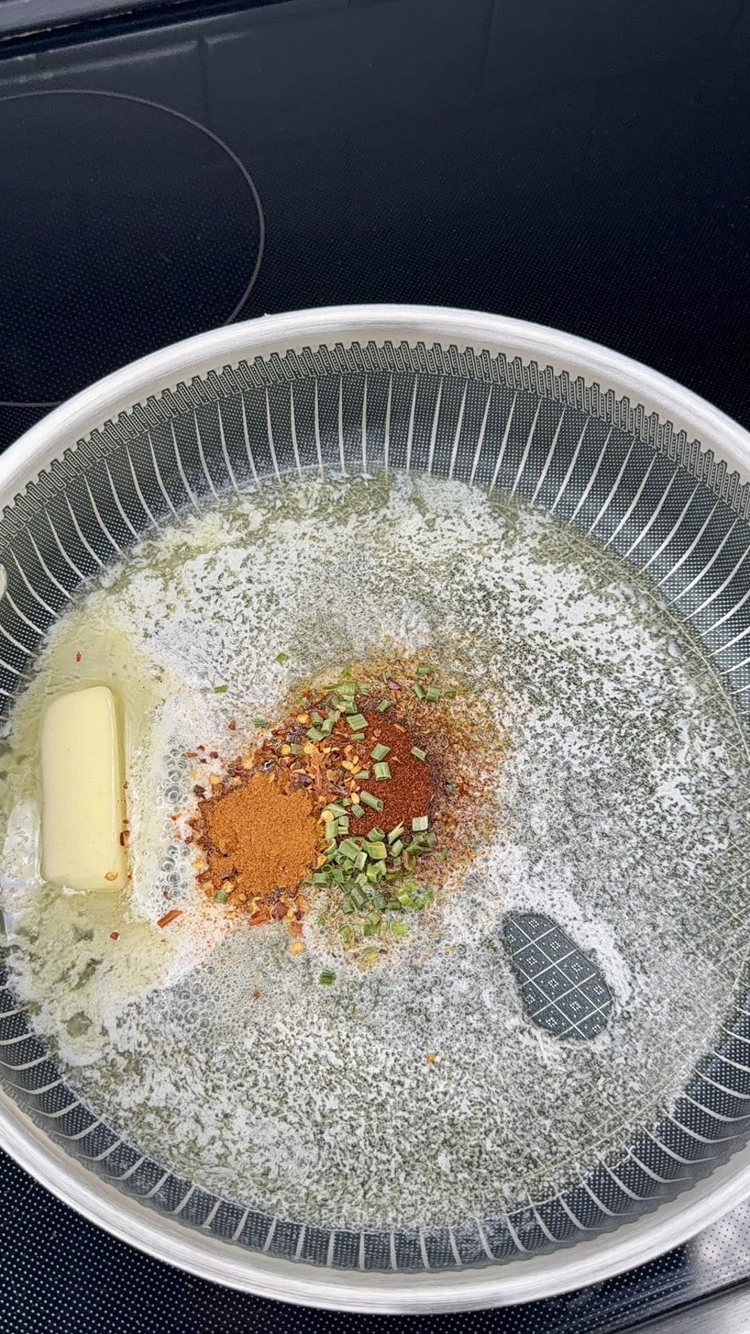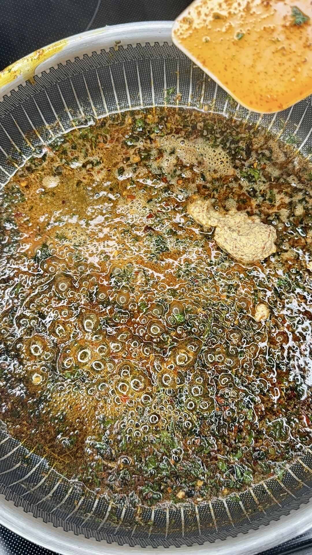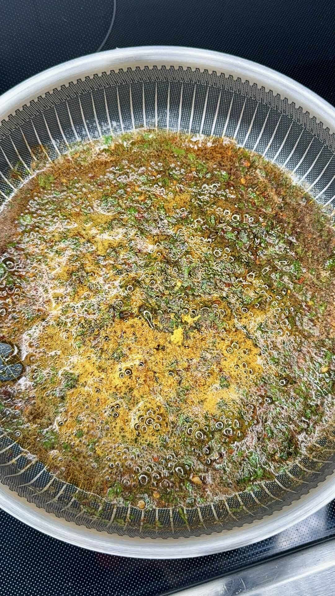 - Sauté the cowboy butter mix: In a large skillet, melt the butter. Add onions and jalapeños. Cook until softened and golden, about 15 minutes. Stir in garlic, lemon juice + zest, Dijon, paprika, cayenne, parsley, chives, thyme, red pepper flakes, salt, and pepper. Cook 1–2 minutes until fragrant. Remove from heat and let cool slightly.