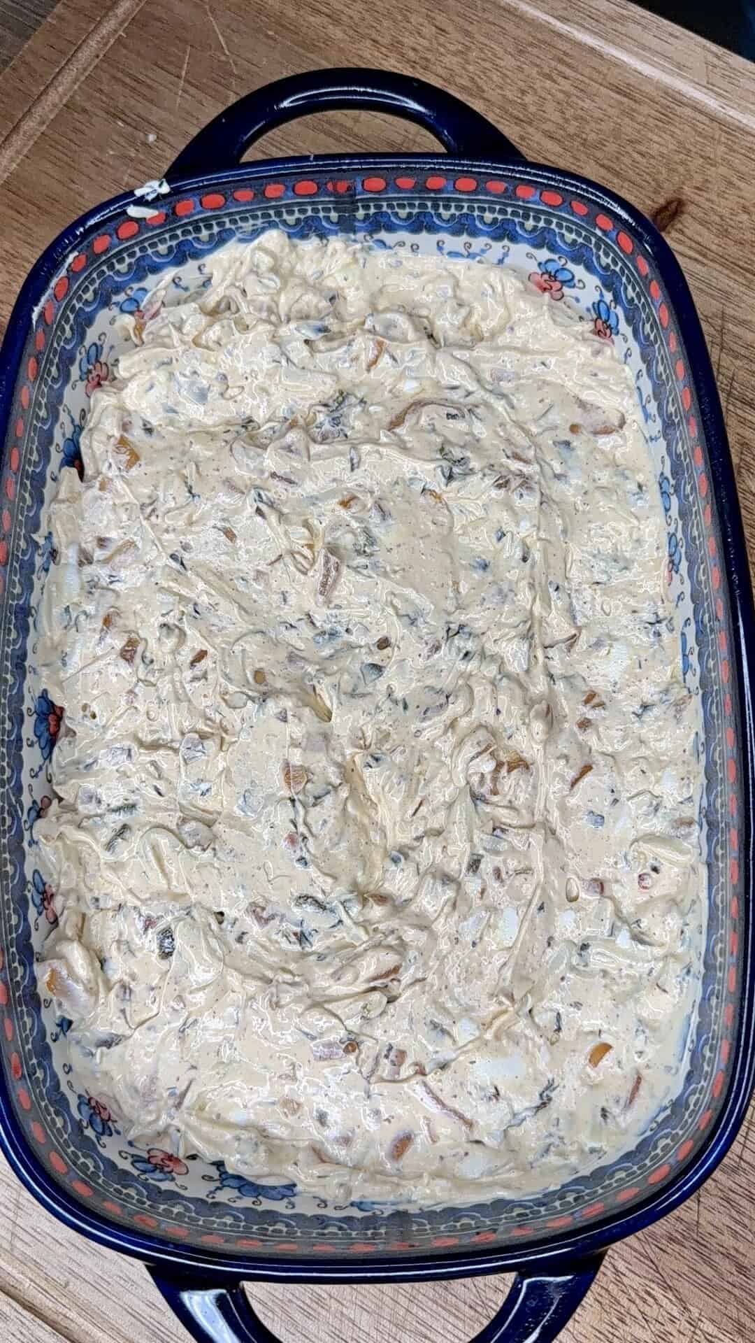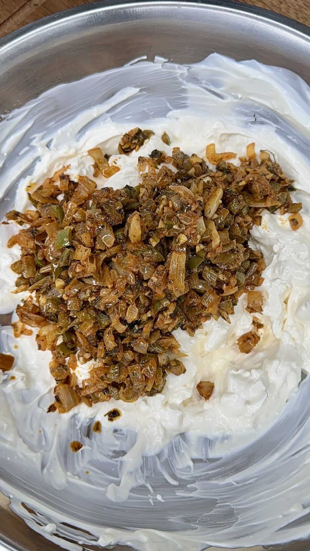 - Assemble: Spread the dip mixture into a small baking dish (an 8×8 or pie plate works great). Top evenly with the 3 oz of freshly shredded mozzarella. Dot the reserved onion/jalapeño mixture over the top.