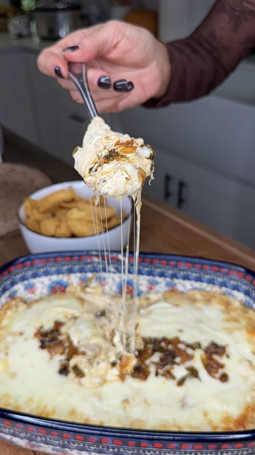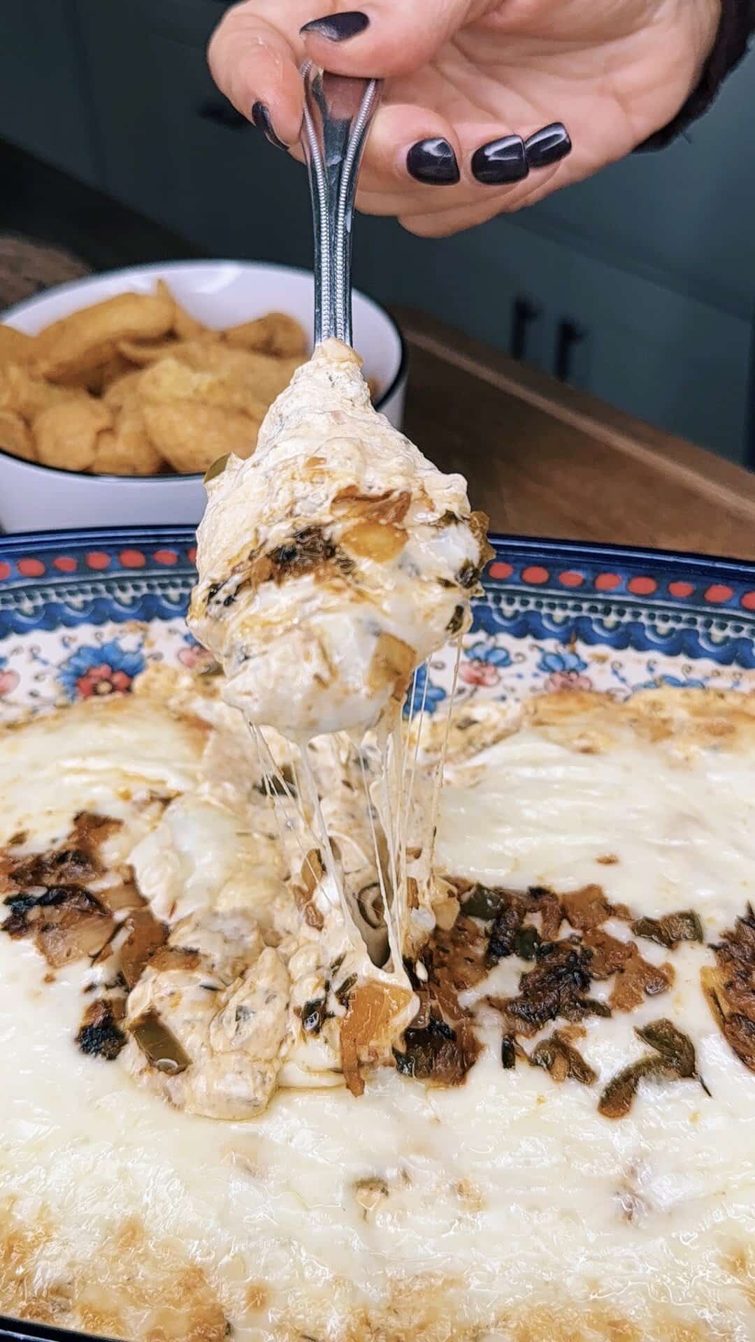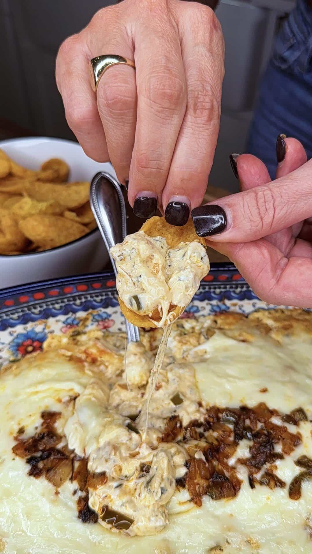 Ruffles chips and Fritos scoops are my go-to. Pretzel crisps, toasted baguette slices, or even veggie sticks also work.