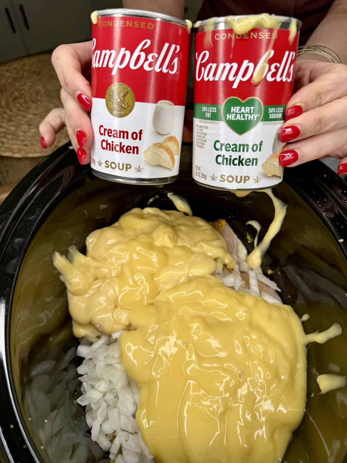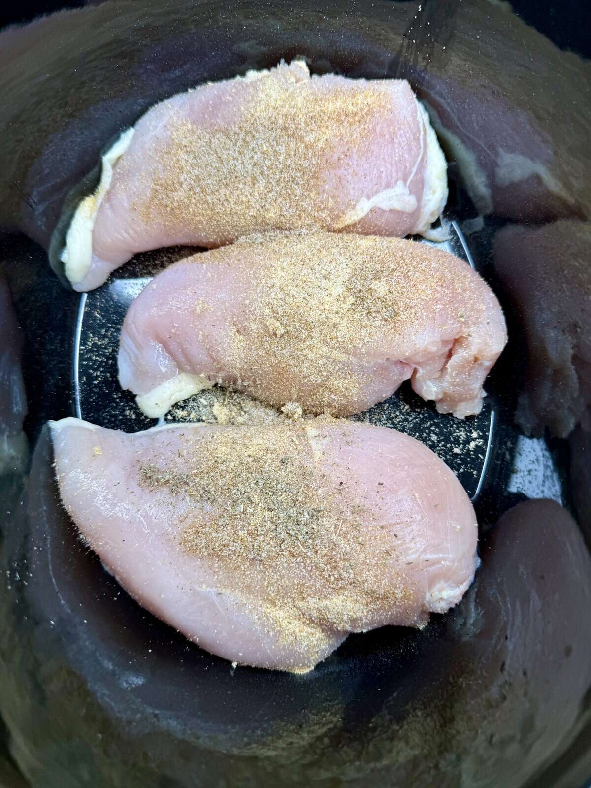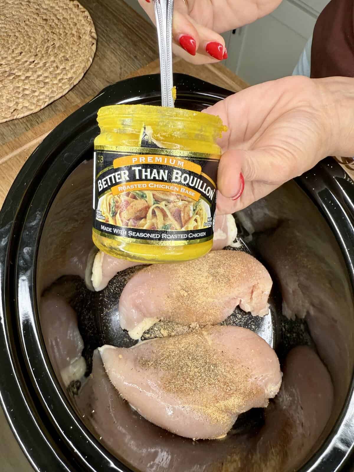 - Load the slow cooker: Add chicken, cream of chicken soup, chicken broth, Better Than Bouillon, onion, jarlic, celery salt, garlic powder, onion powder, and poultry seasoning.