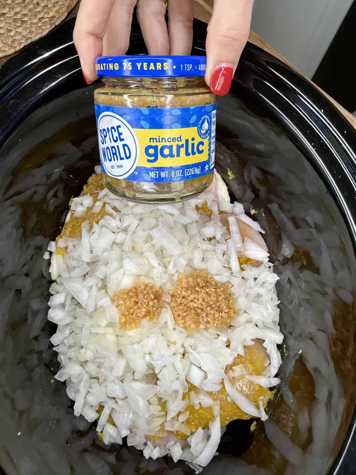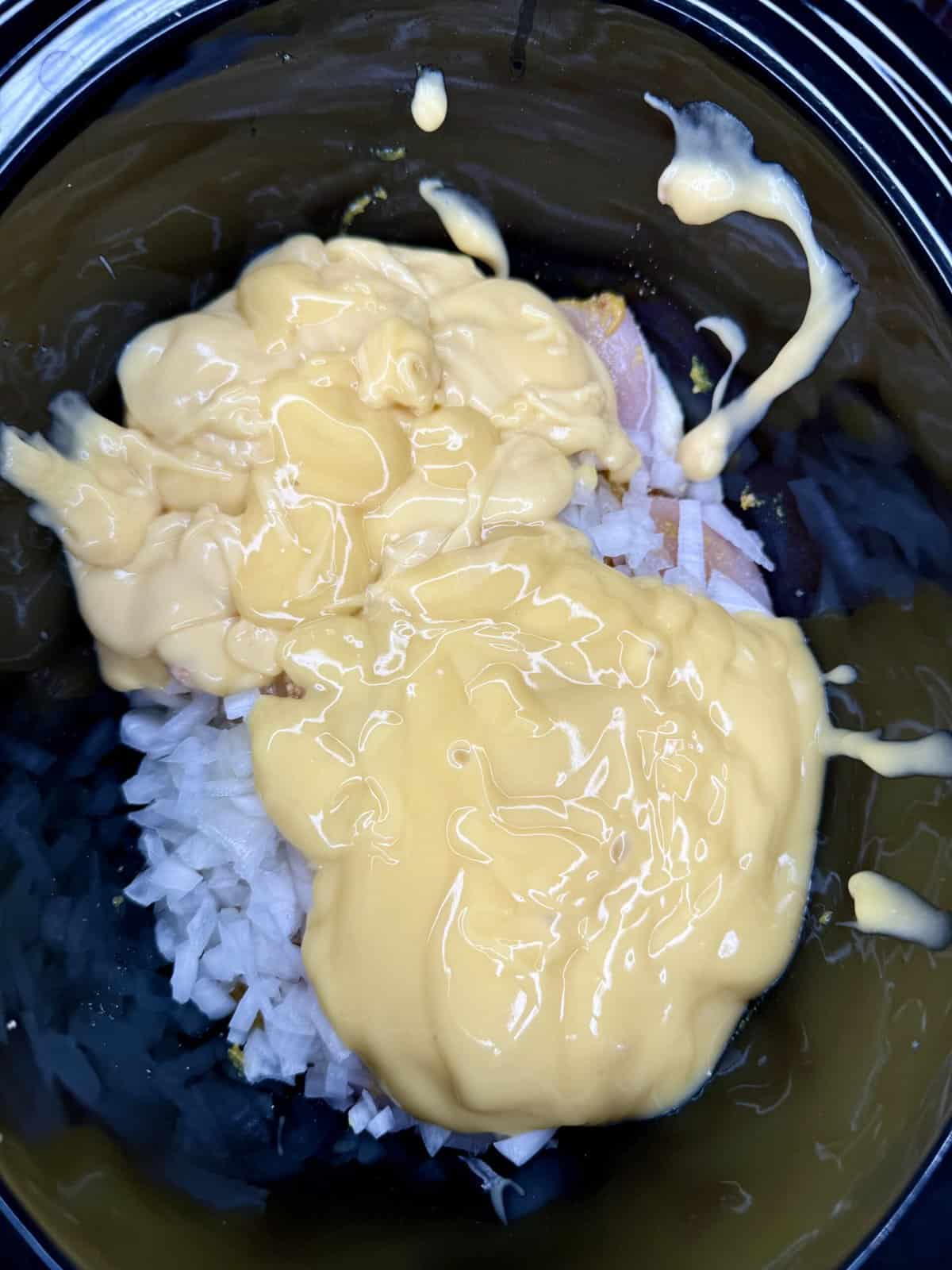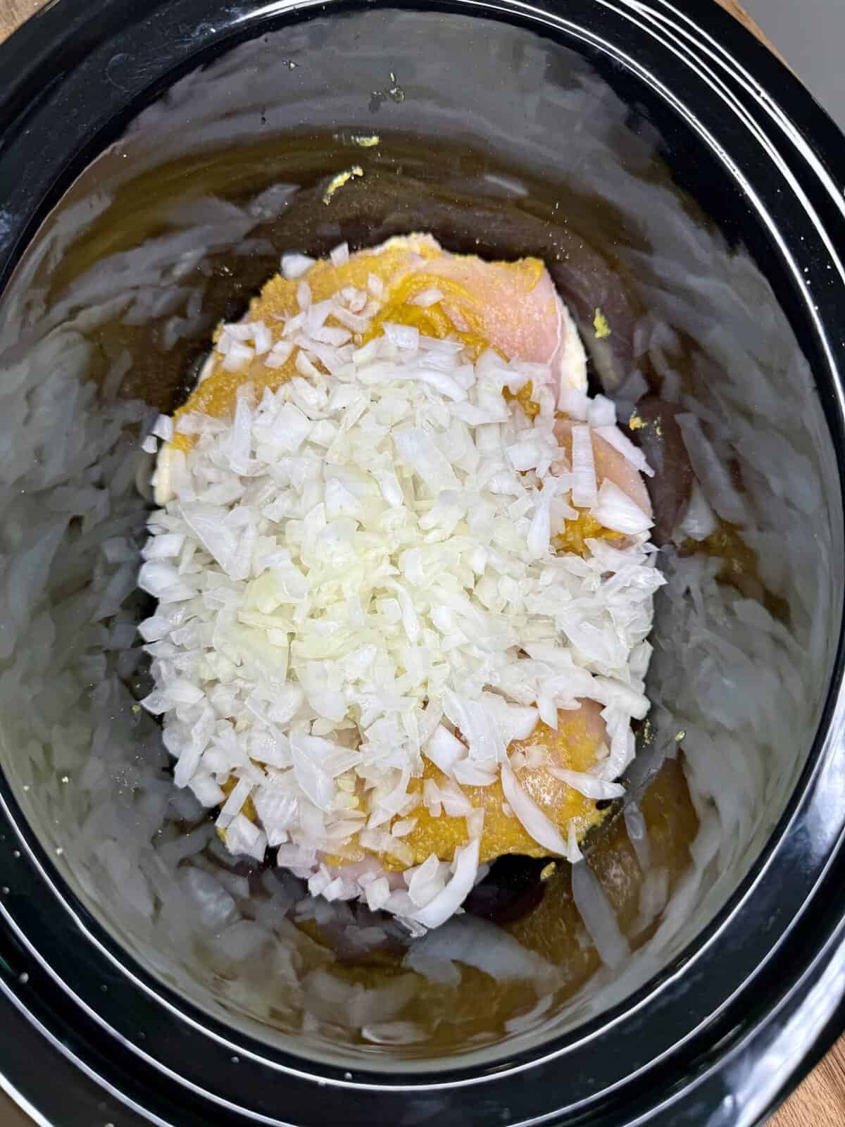 - Load the slow cooker: Add chicken, cream of chicken soup, chicken broth, Better Than Bouillon, onion, jarlic, celery salt, garlic powder, onion powder, and poultry seasoning.