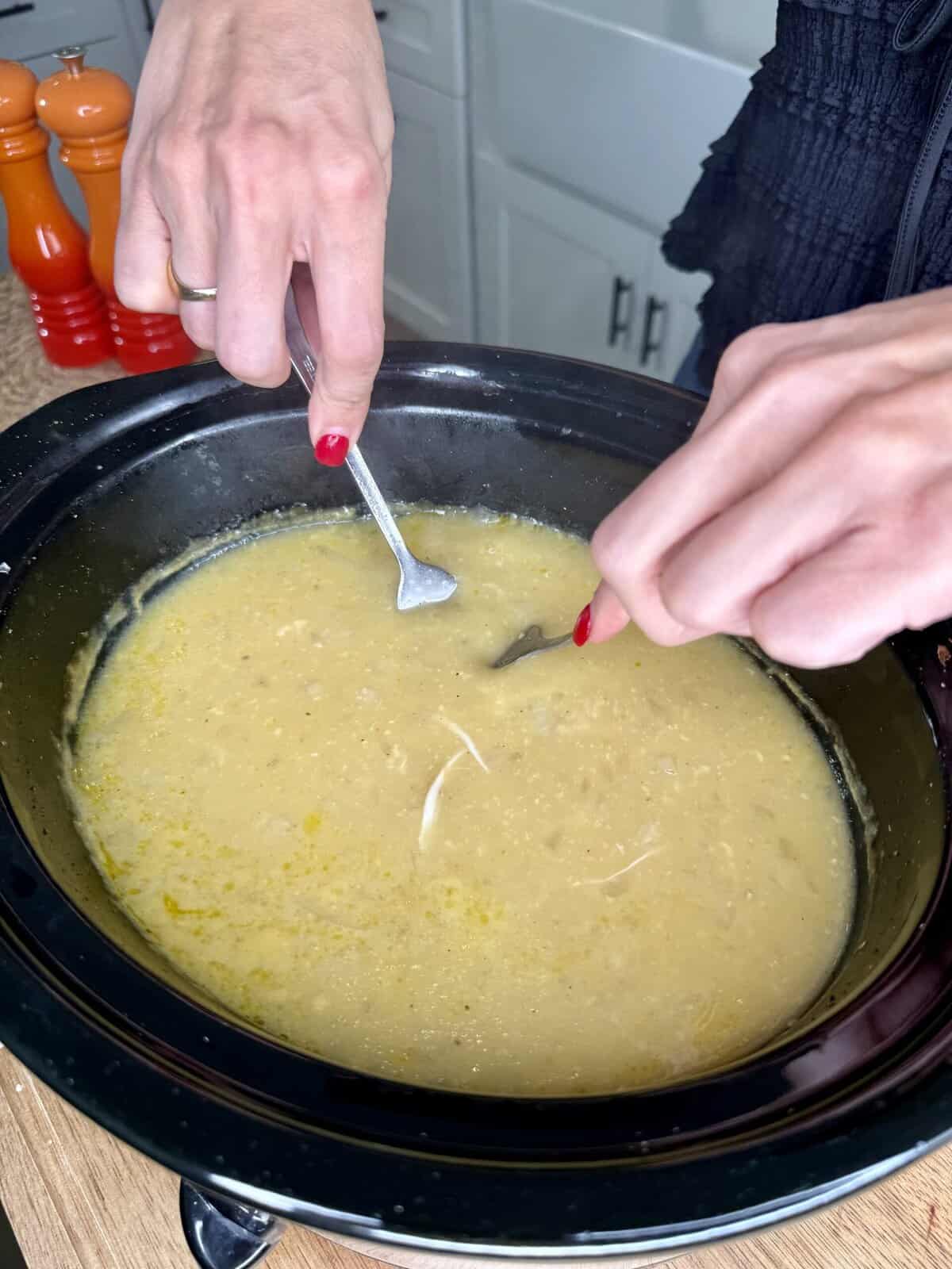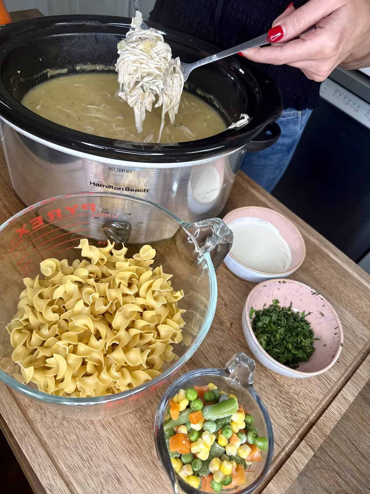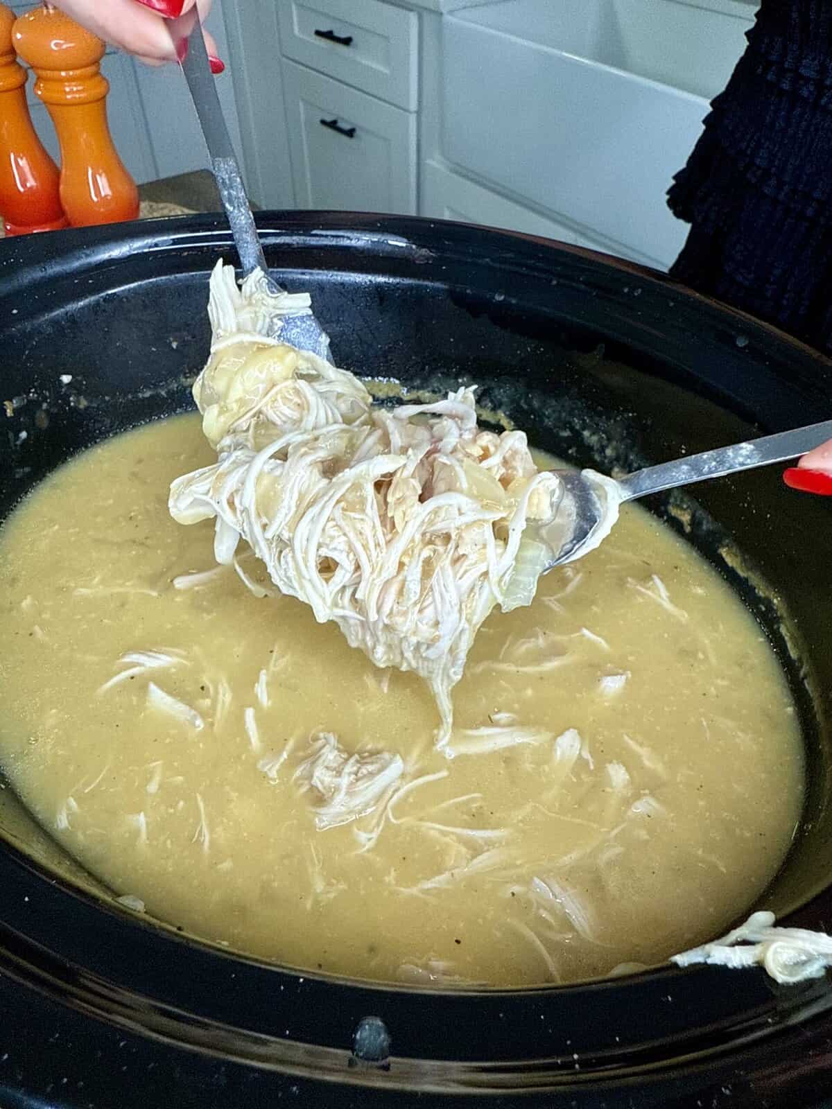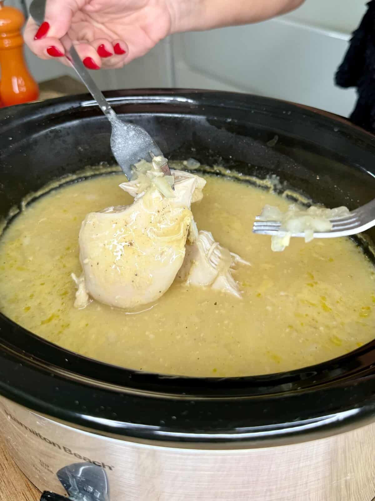 - Shred: Remove chicken, shred with two forks, and return to the crockpot.