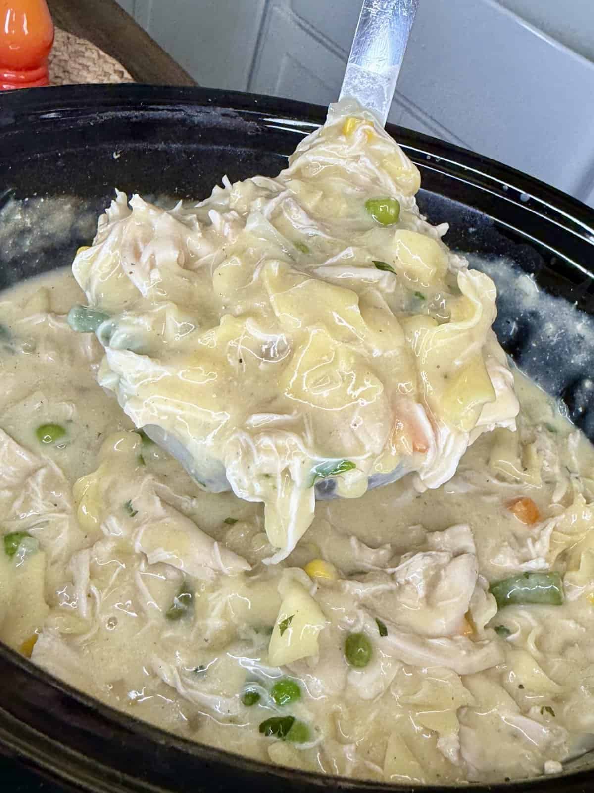 - Add noodles: Stir in egg noodles and peas/carrots (if using). Cook on High for 20–30 minutes, stirring once halfway through, until noodles are tender. Stir in heavy cream (if using) and adjust seasoning. Garnish with parsley before serving.