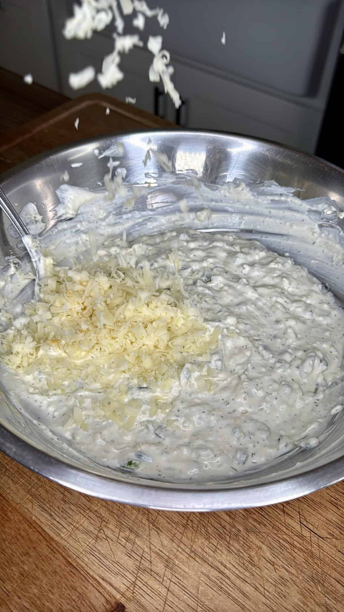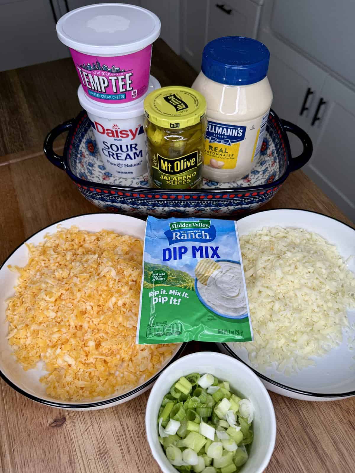 - 8 oz block Colby Jack cheese freshly shredded (use ¾ in dip, reserve ¼ for garnish)