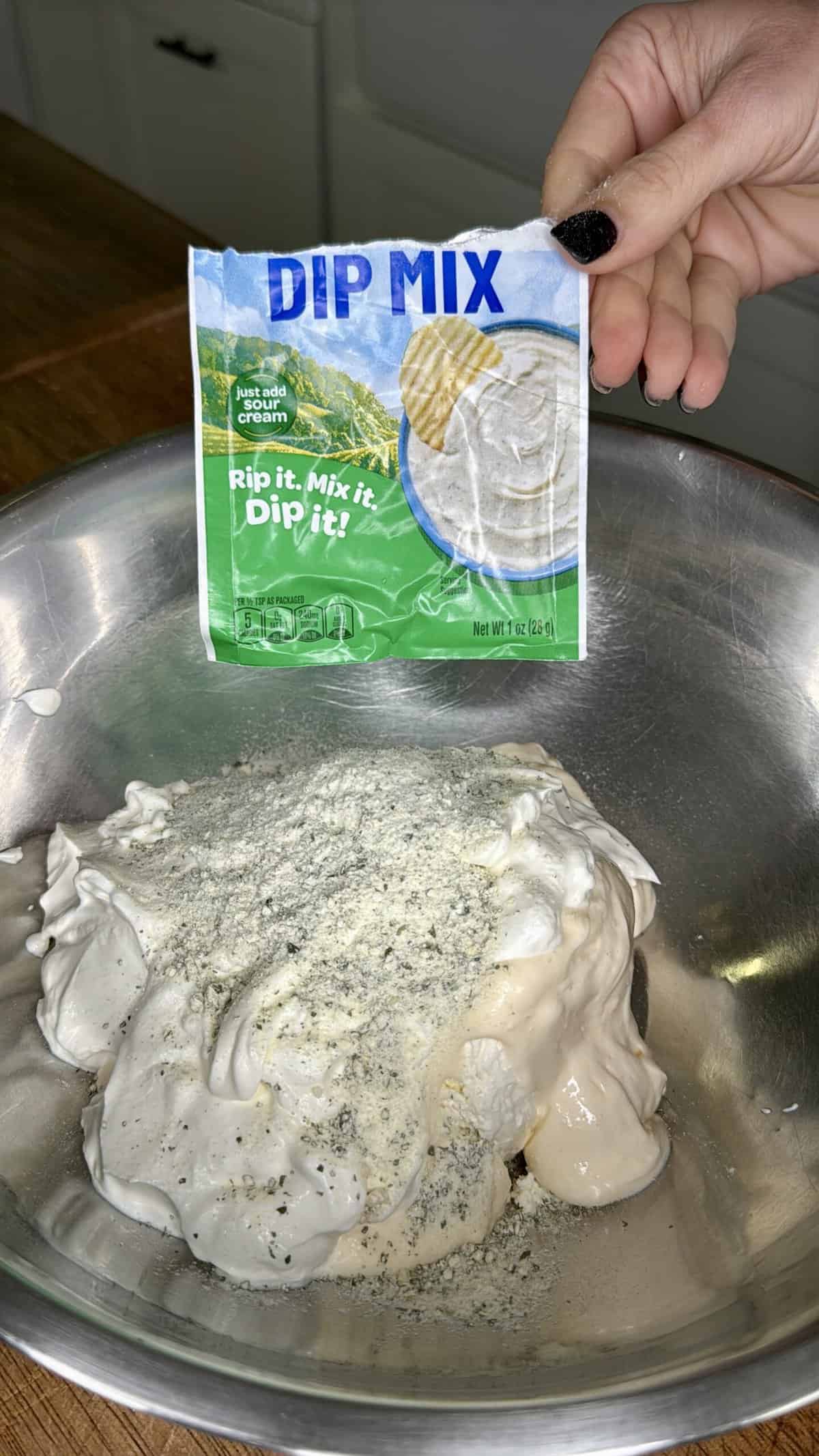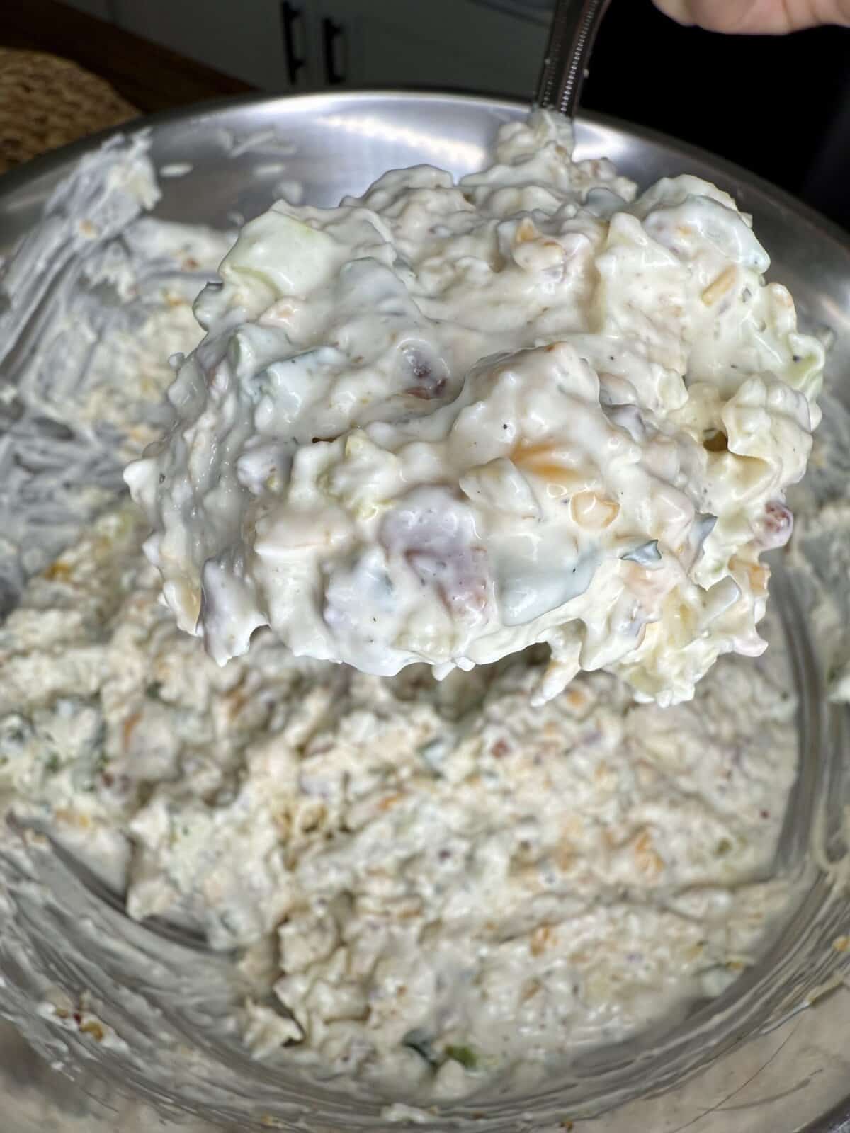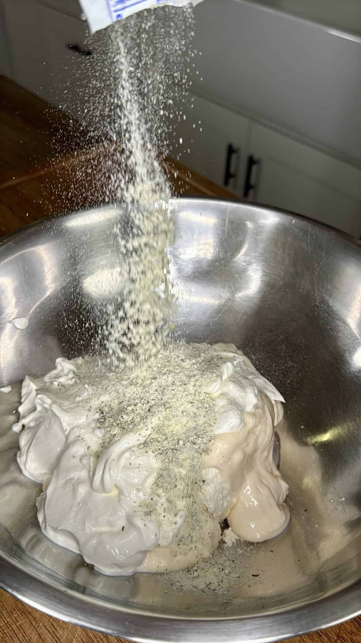- In a large bowl, stir together whipped cream cheese, mayo, sour cream, and ranch seasoning until smooth.