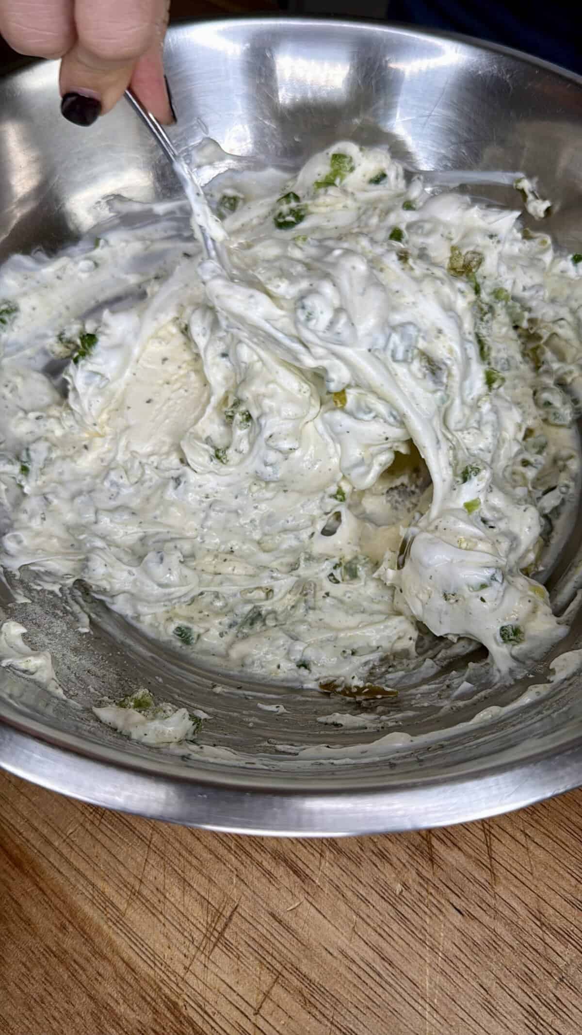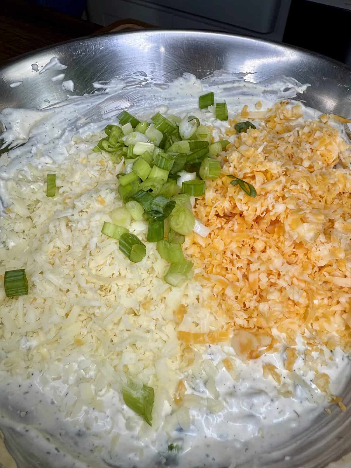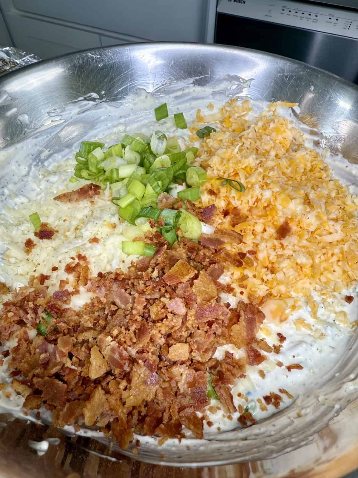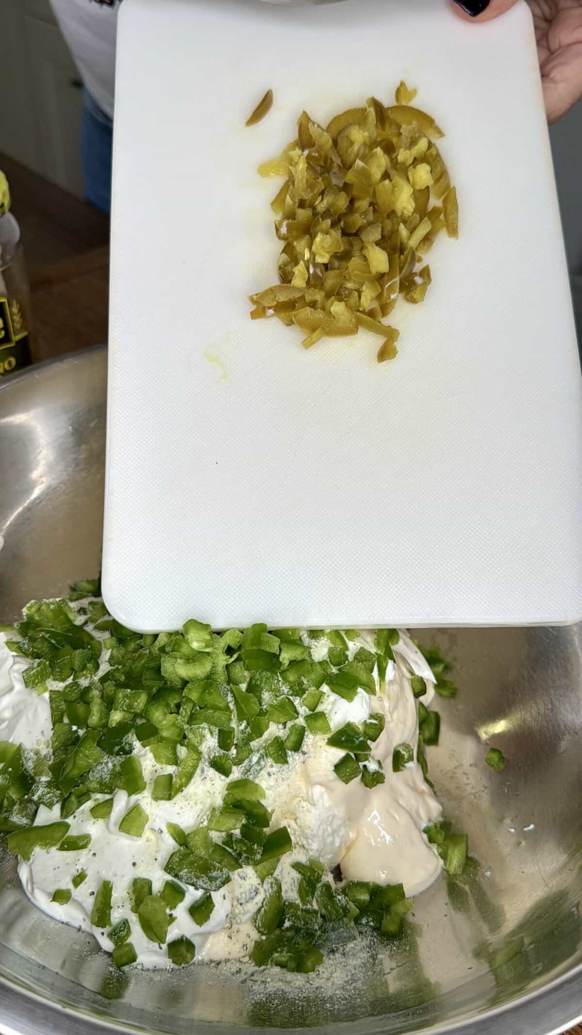 - Mix in mozzarella, ¾ of the Colby Jack, fresh jalapeños, diced jarred jalapeños, most of the bacon, and green onions.