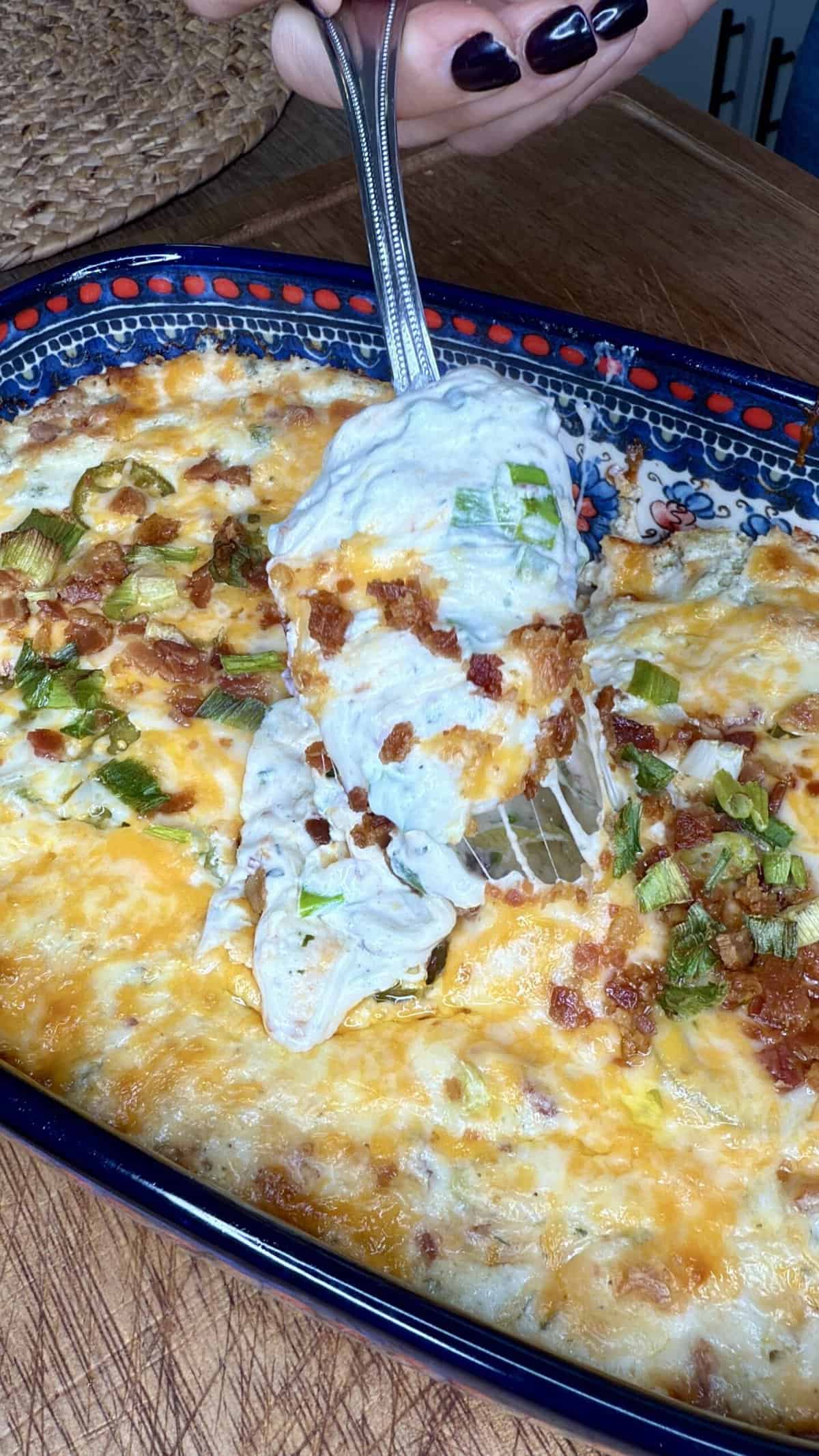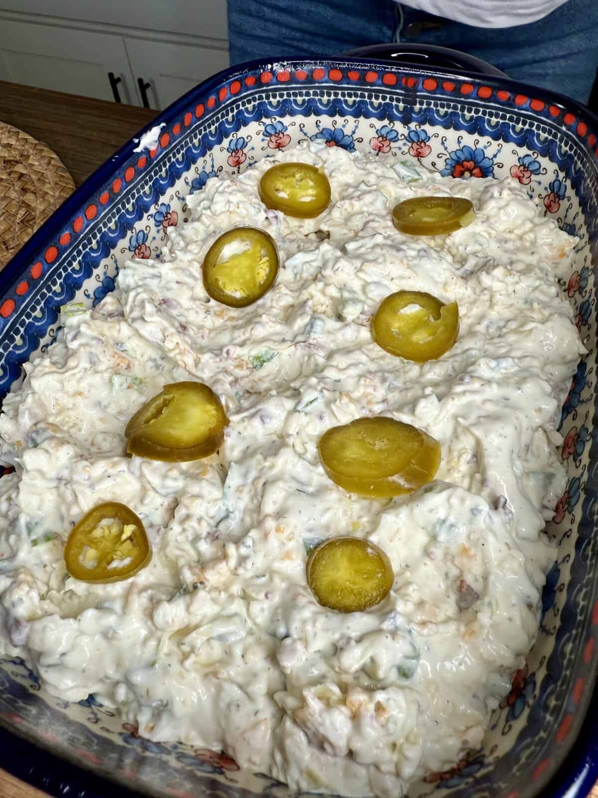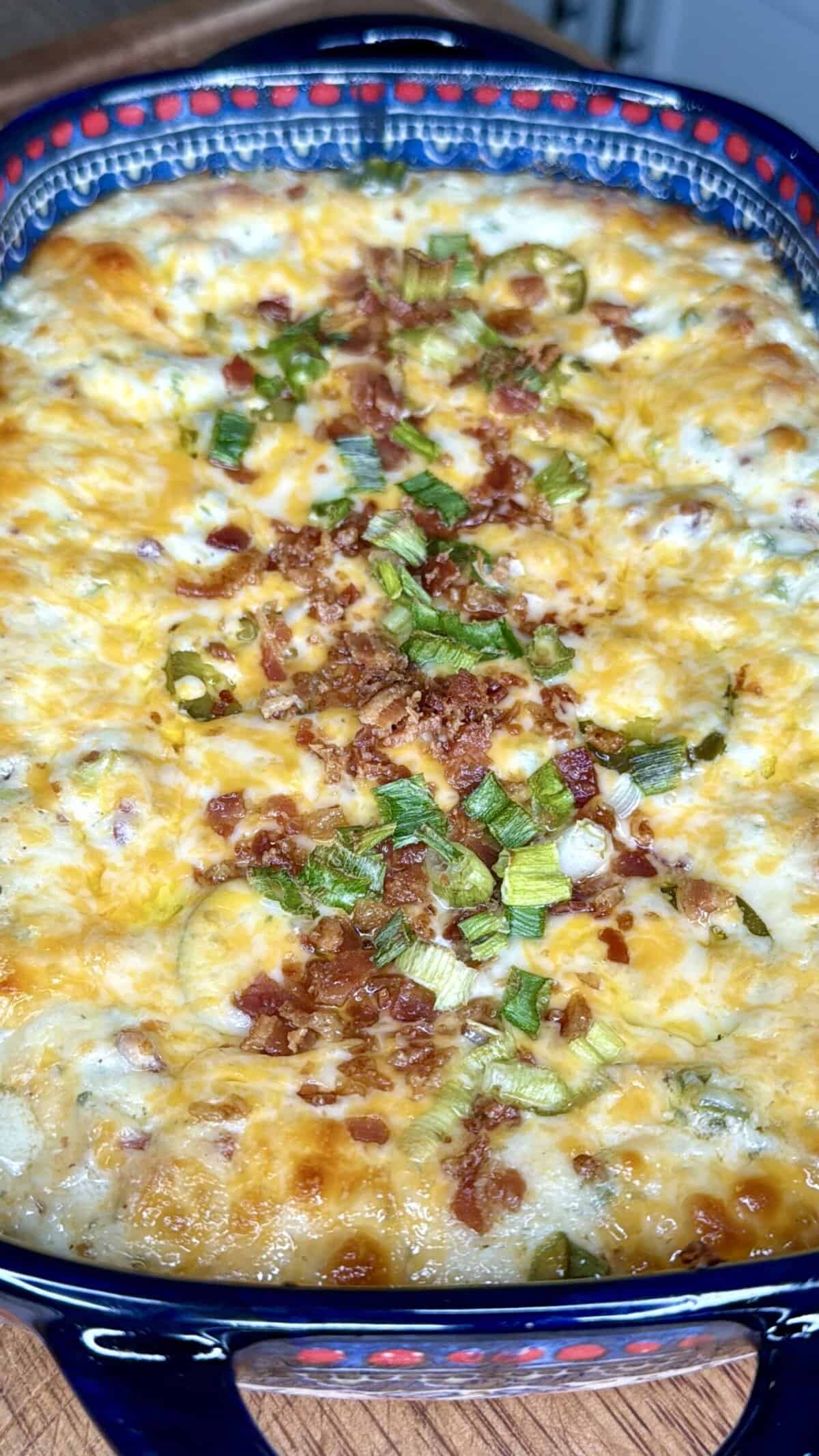 - Garnish before baking: layer the 6 whole jalapeño slices on top, then sprinkle with the reserved Colby Jack, bacon bits, and green onions (down the center).