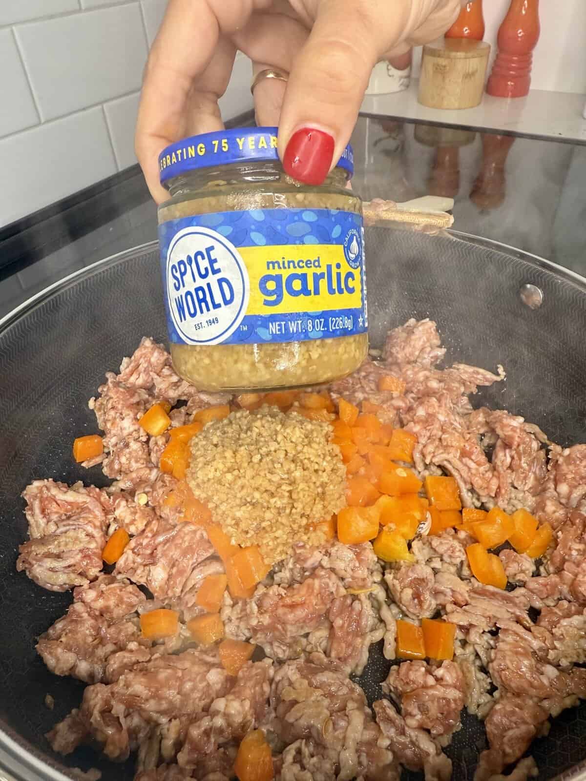 - In a large skillet over medium-high heat, add the bulk Italian sausage and break it up with a spoon or meat masher. Once it starts to brown, add the diced bell pepper and chopped garlic. Cook until the sausage is browned and cooked through and the vegetables are soft. Set aside.