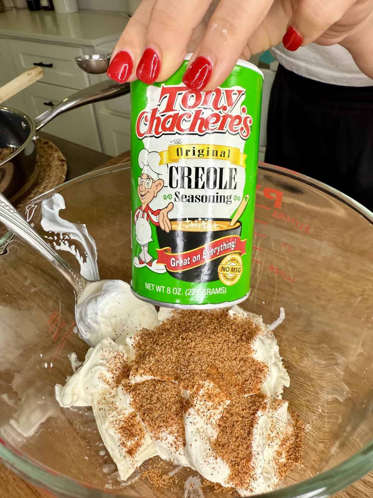 - In a large bowl, mix together the softened cream cheese, sour cream, Tony’s Creole seasoning, garlic powder, and Italian seasoning until smooth.