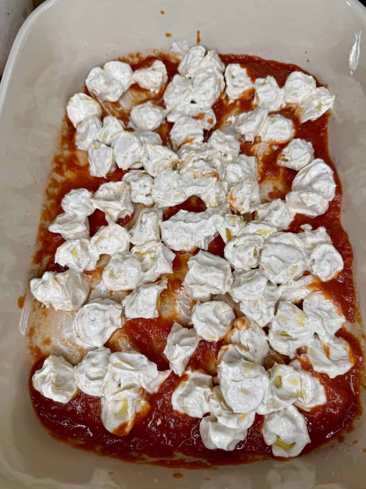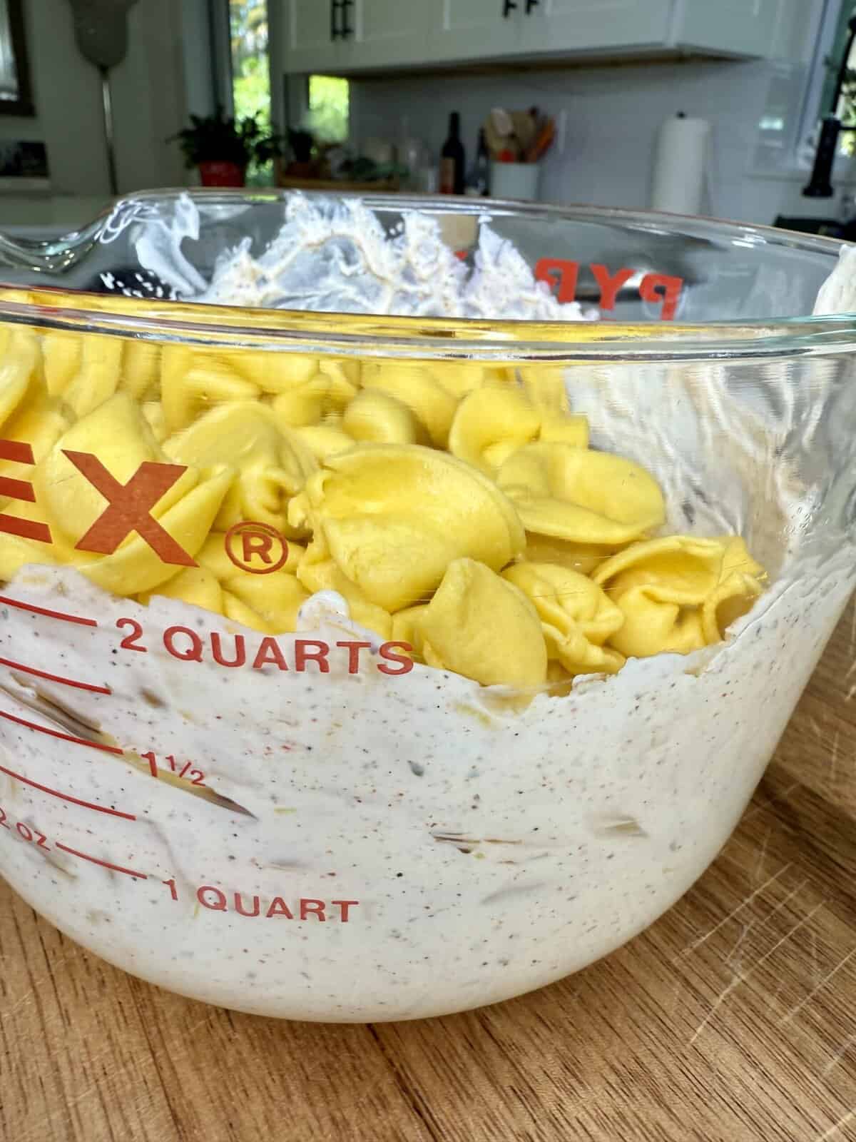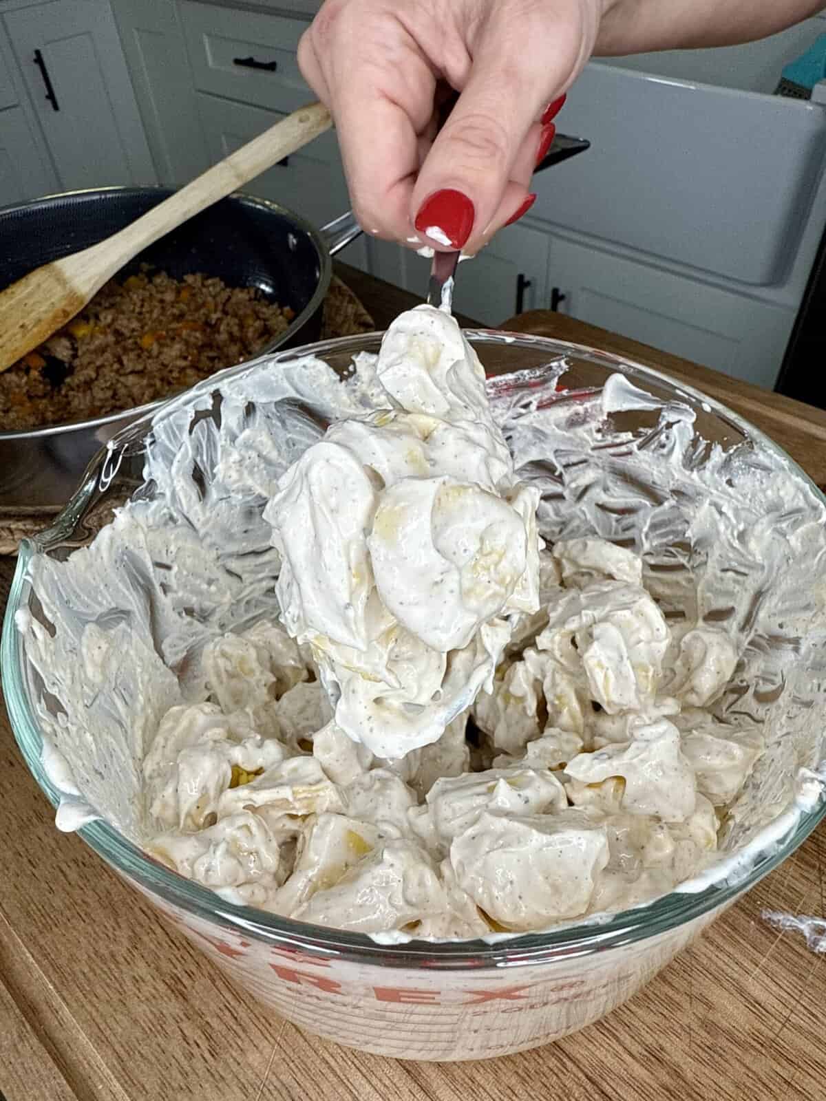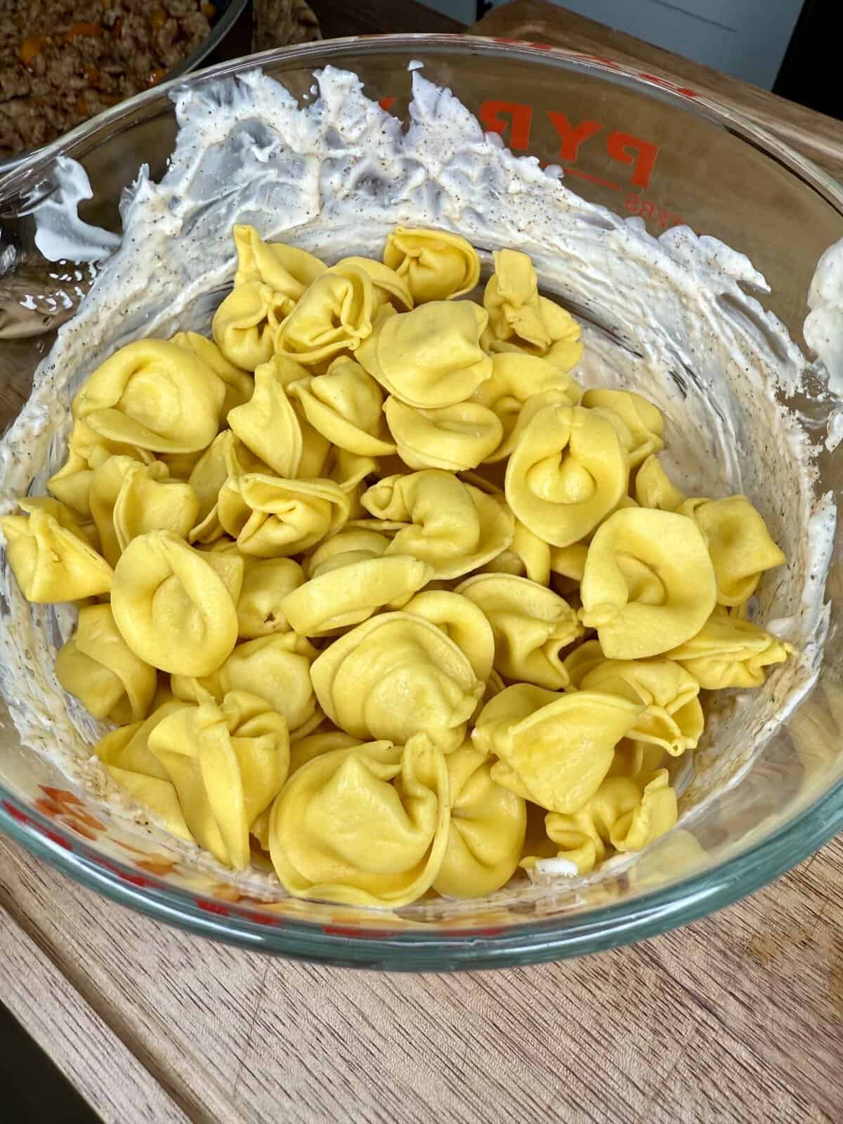 - Add half of the creamy tortellini mixture.