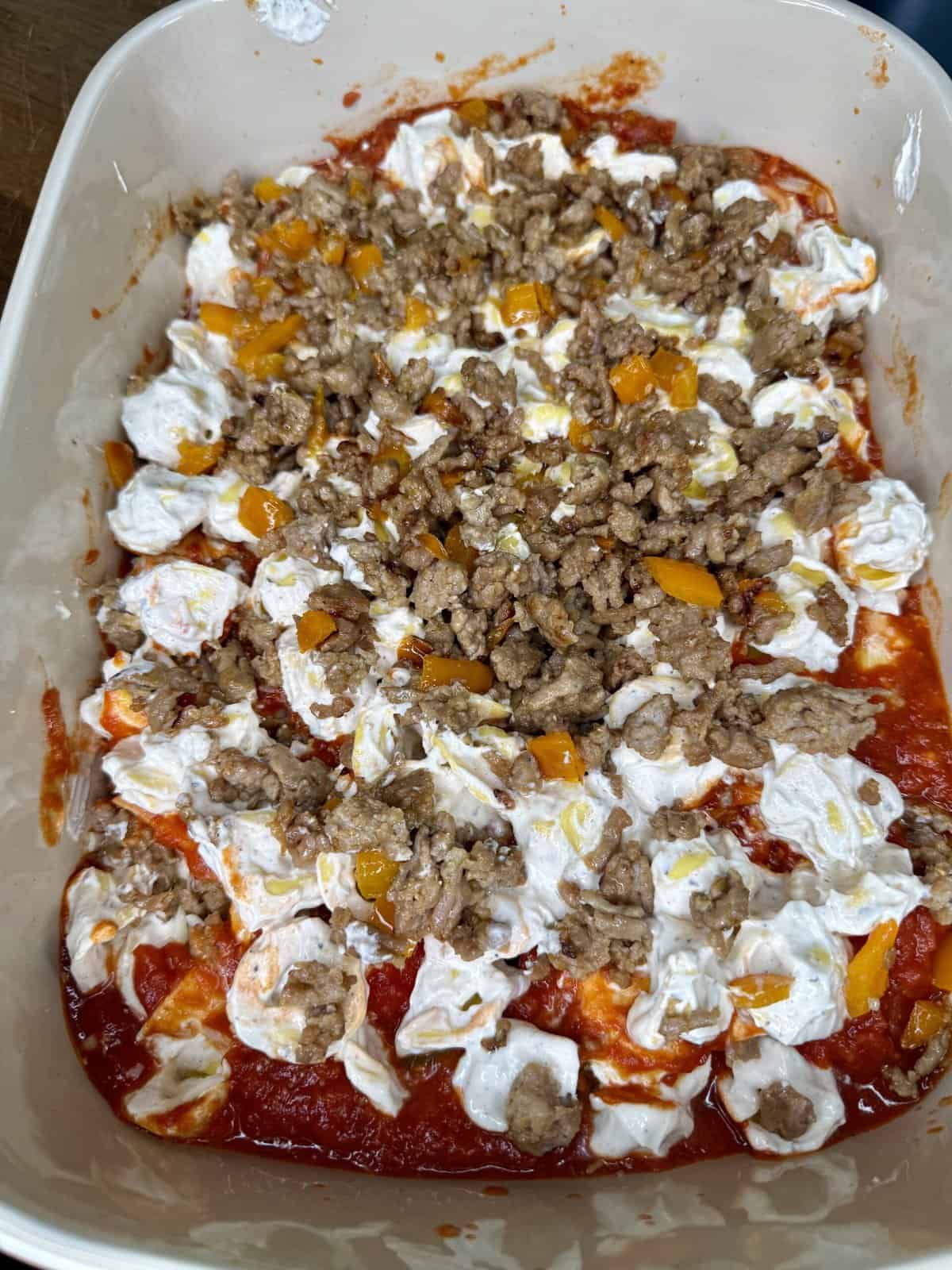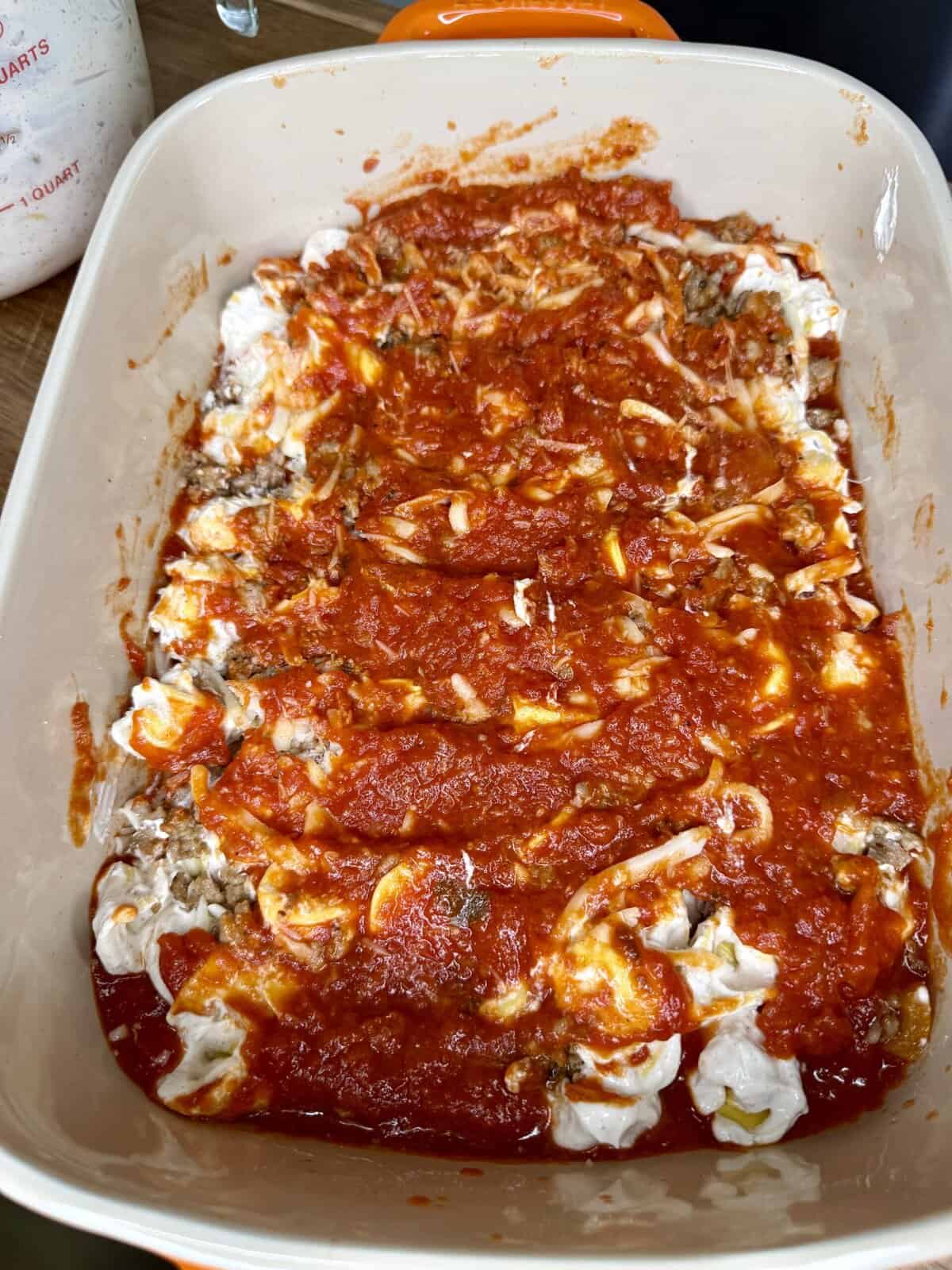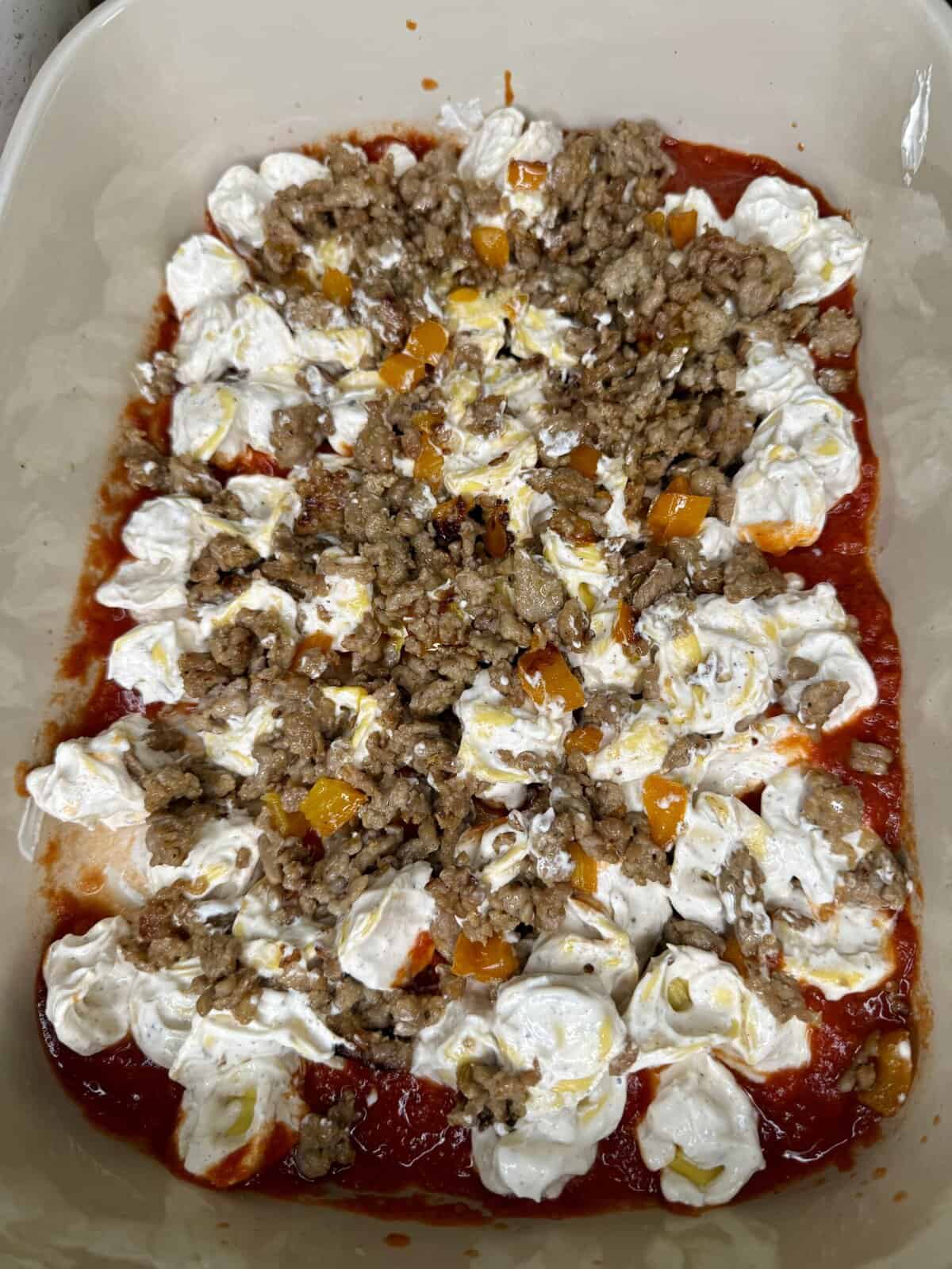 - Repeat with the remaining creamy tortellini, the rest of the sausage, and the remaining marinara.