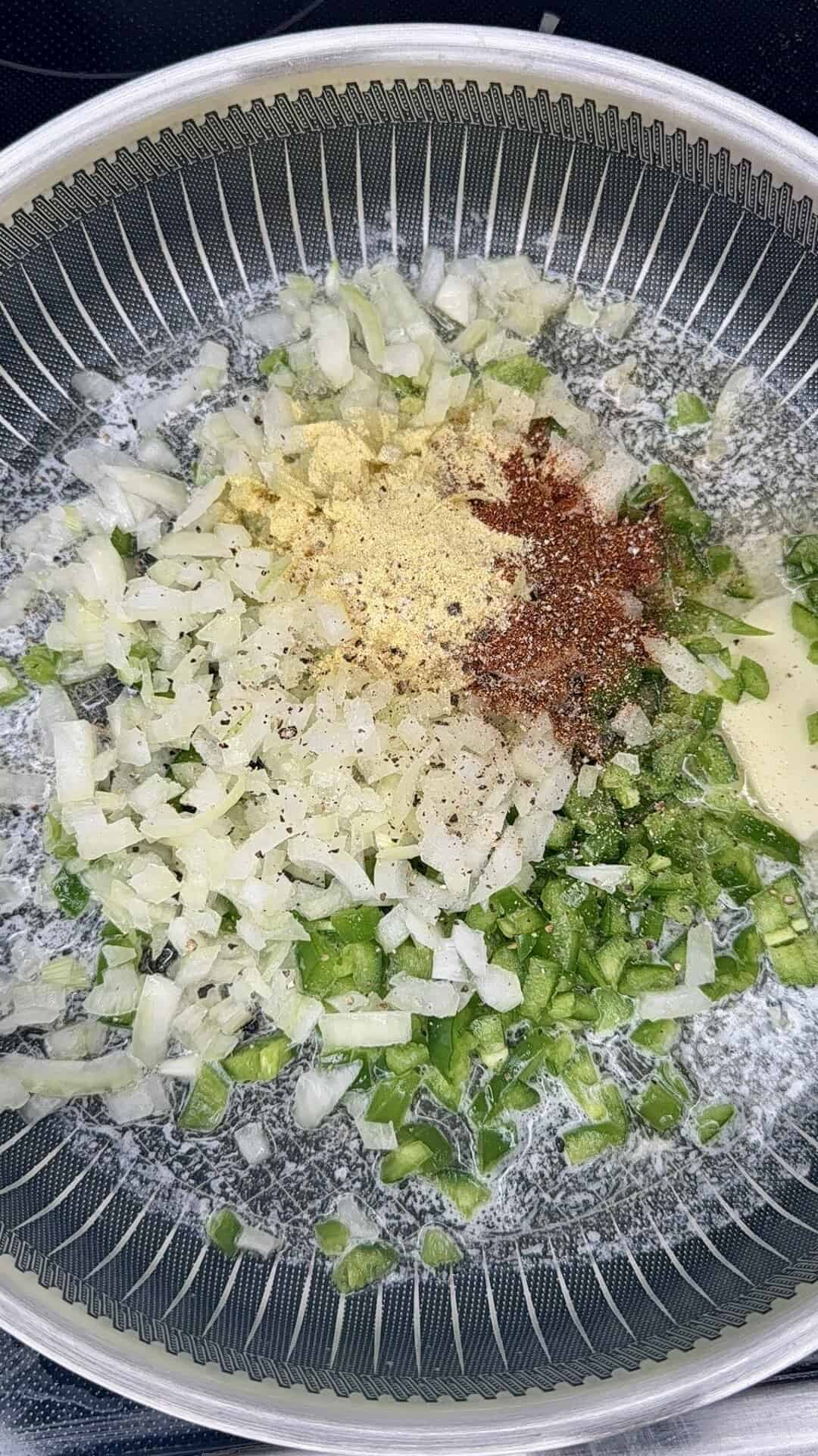 - In a saucepan over medium heat, melt butter. Add onion, jalapeños, and minced garlic with chili peppers. Cook until softened, 3–4 minutes.