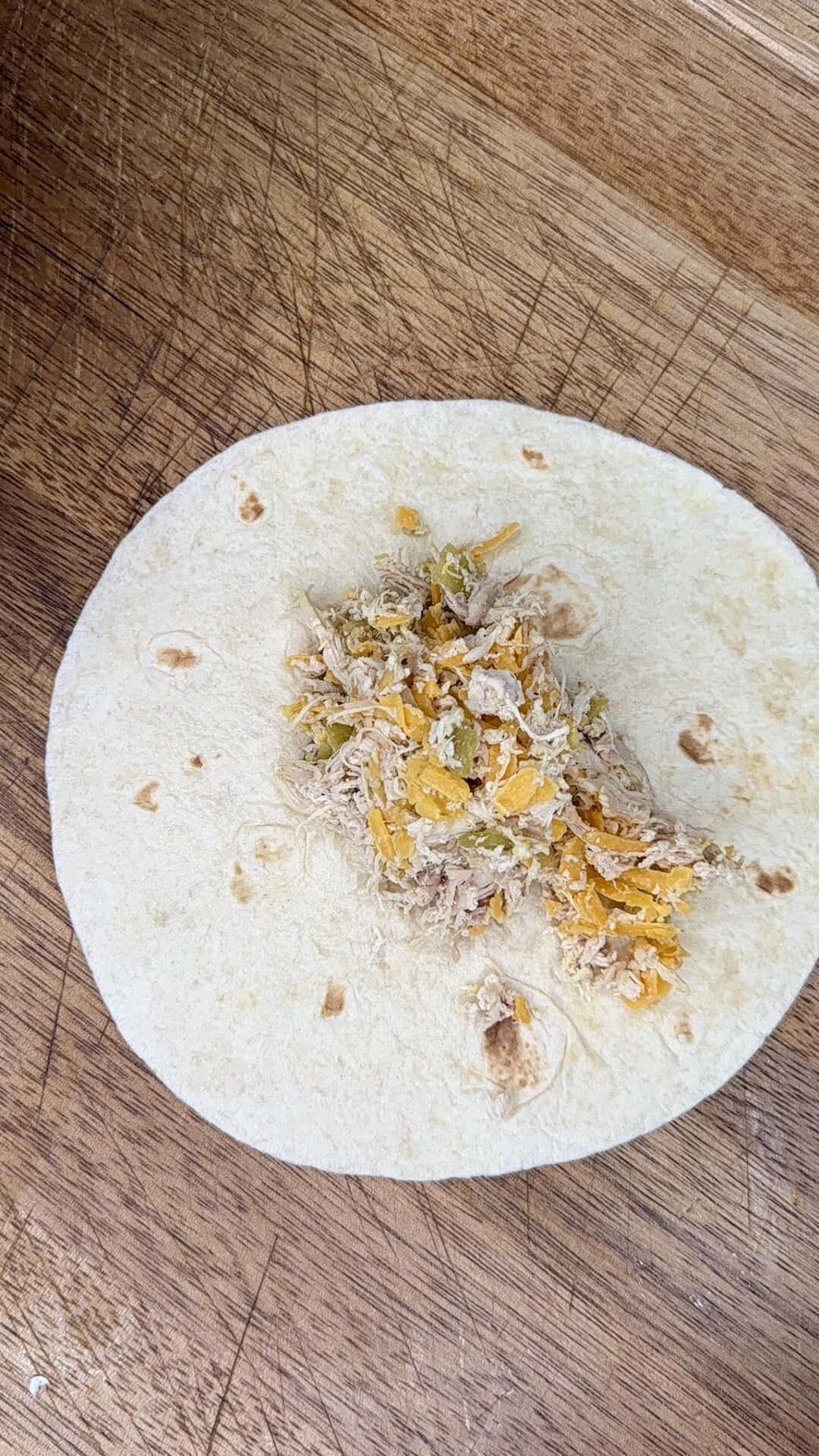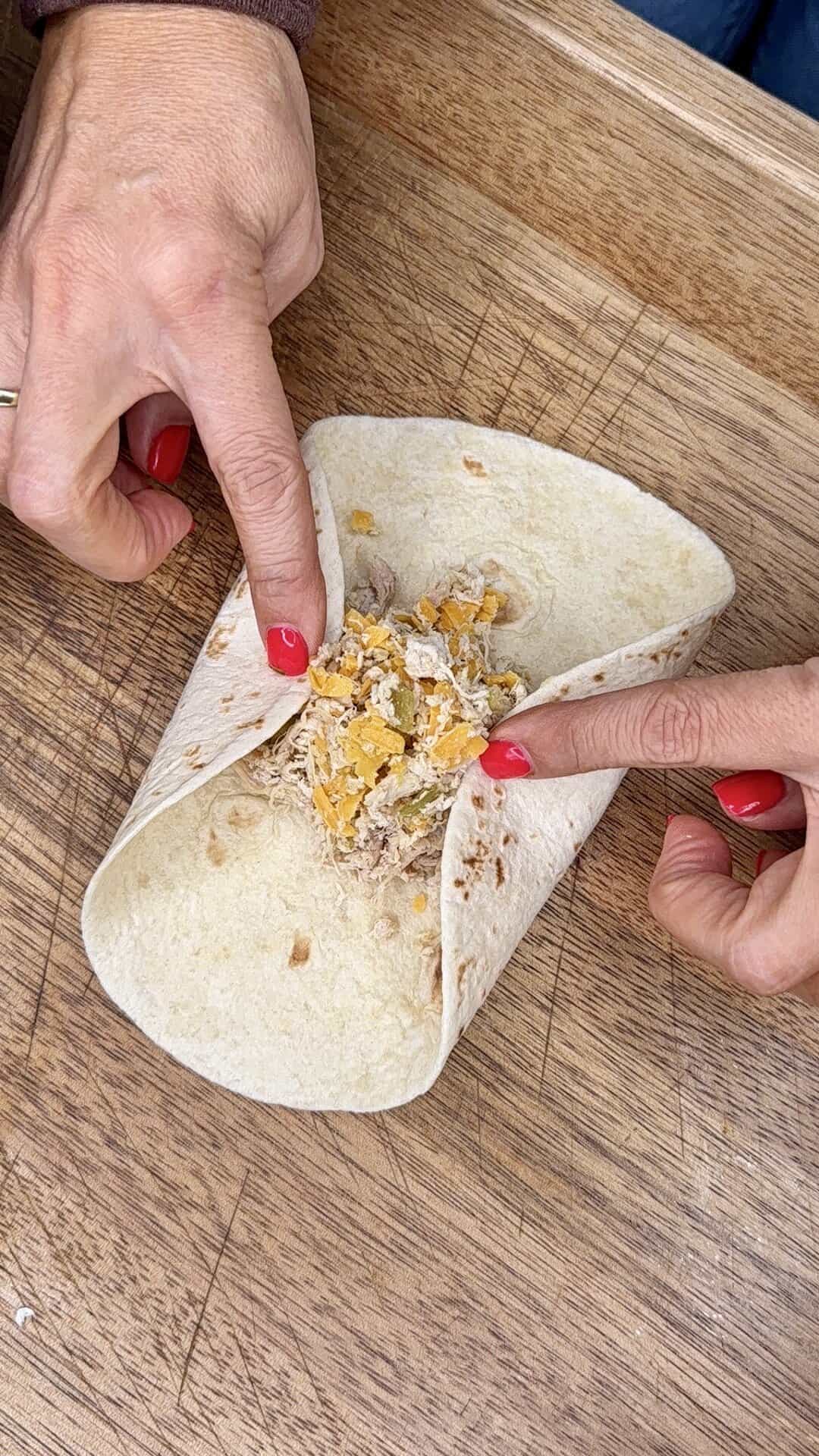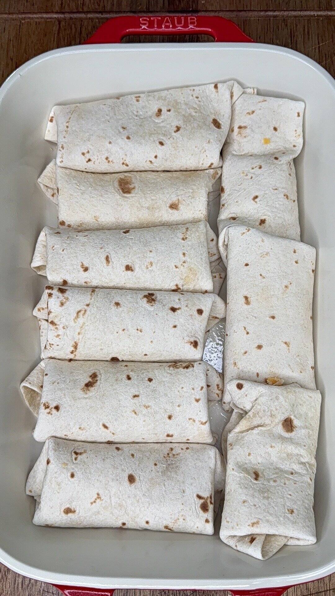 - Spoon chicken filling into tortillas, roll up burrito-style, and place seam-side down in prepared baking dish.