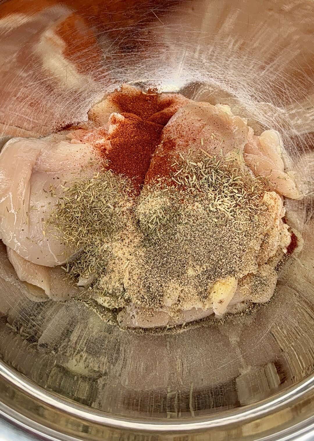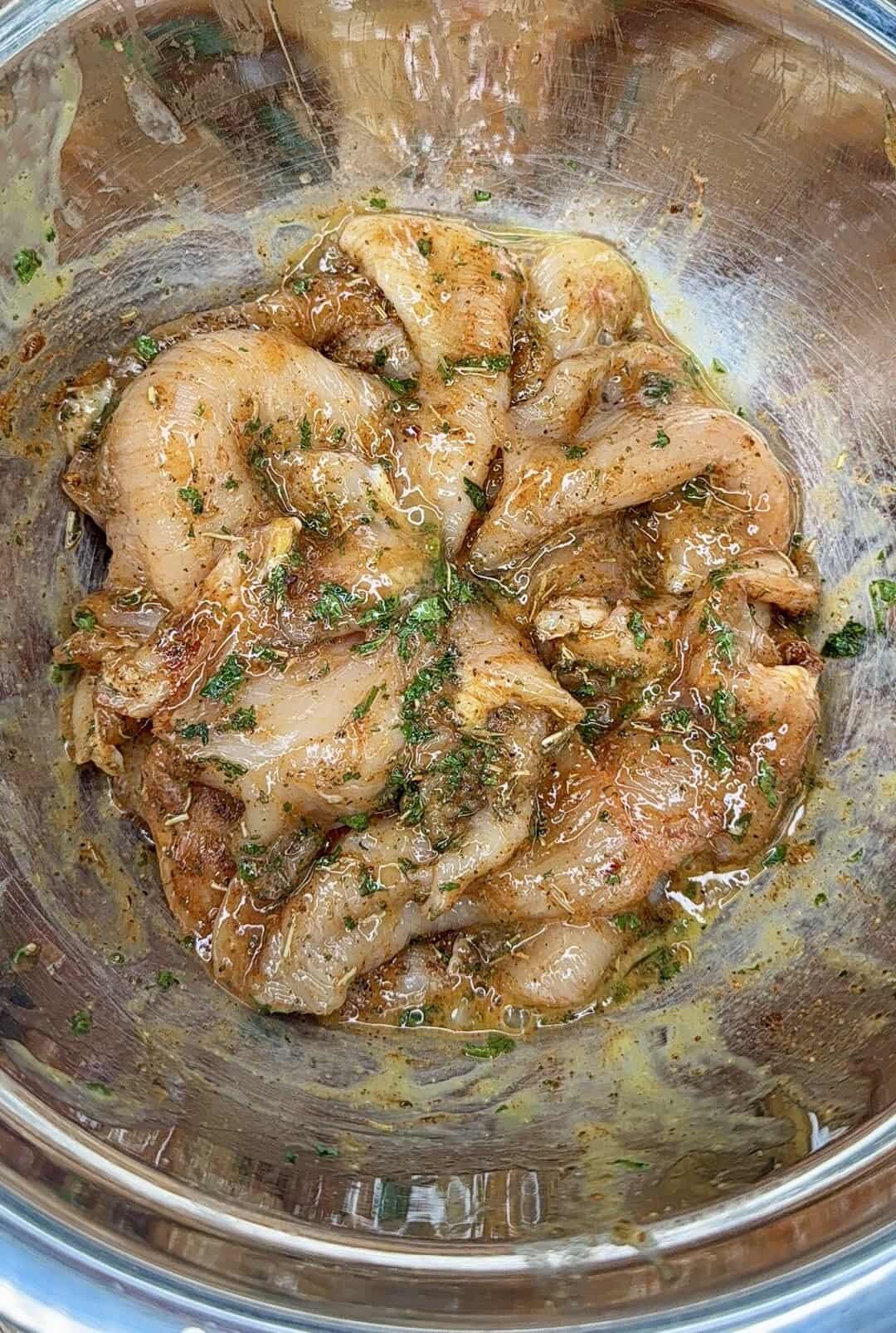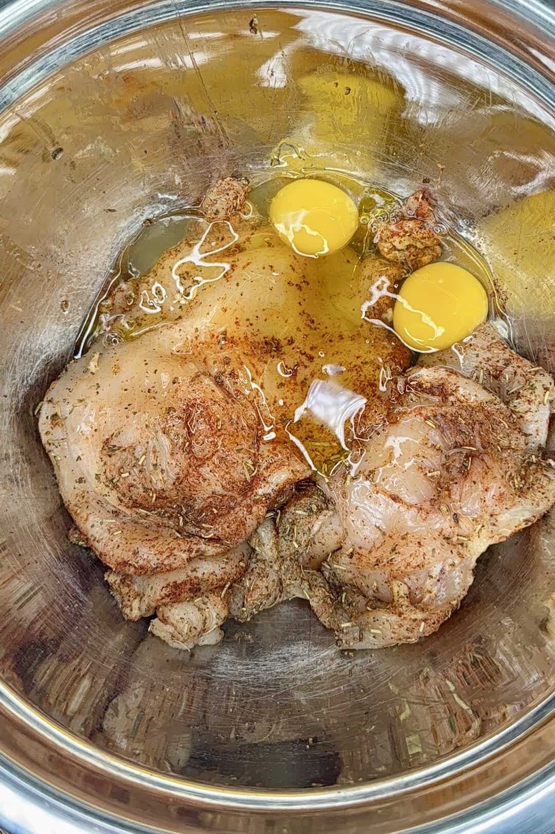 - In a large bowl, add chicken cutlets, eggs, olive oil, basil, rosemary, thyme, garlic powder, salt, black pepper, paprika, crushed red pepper, and parsley.