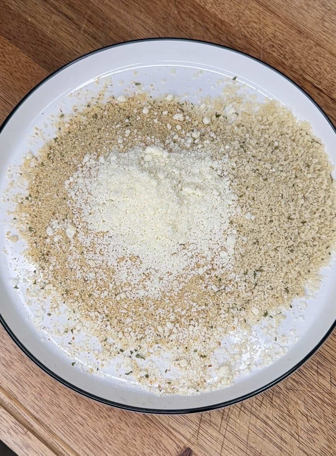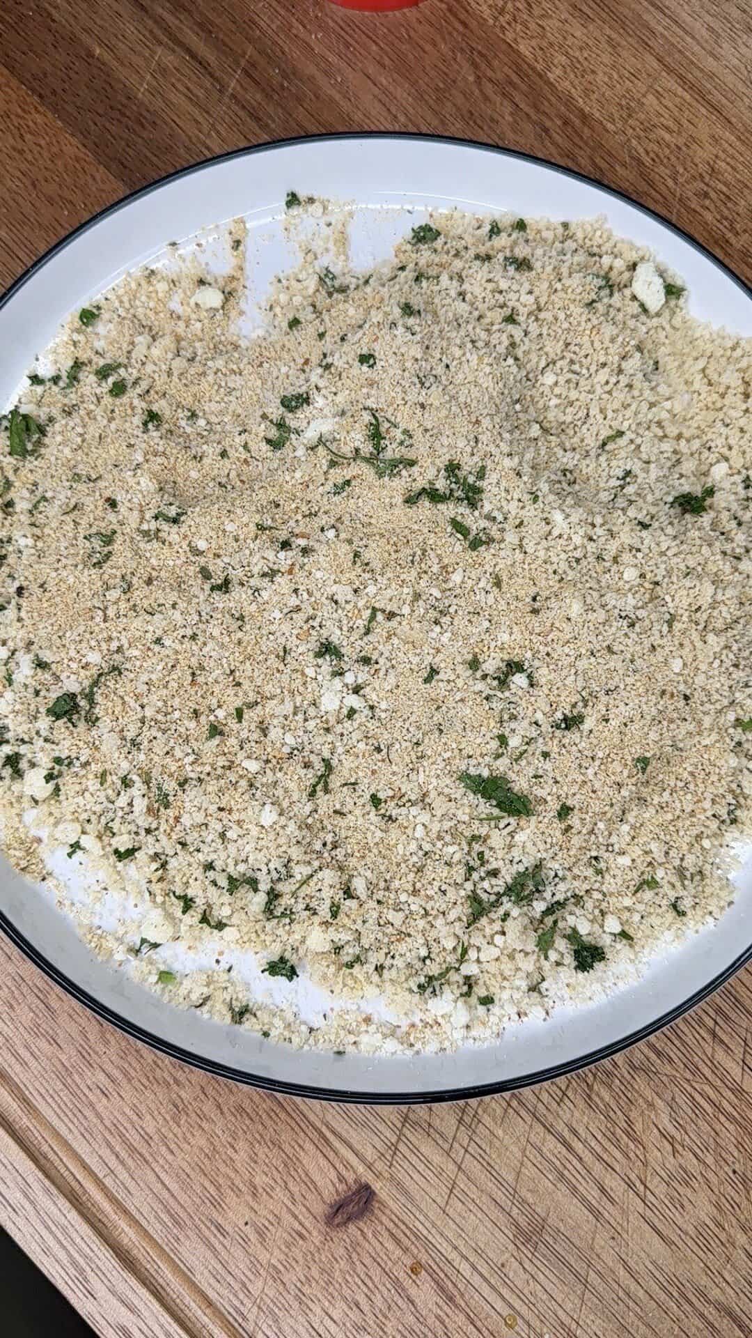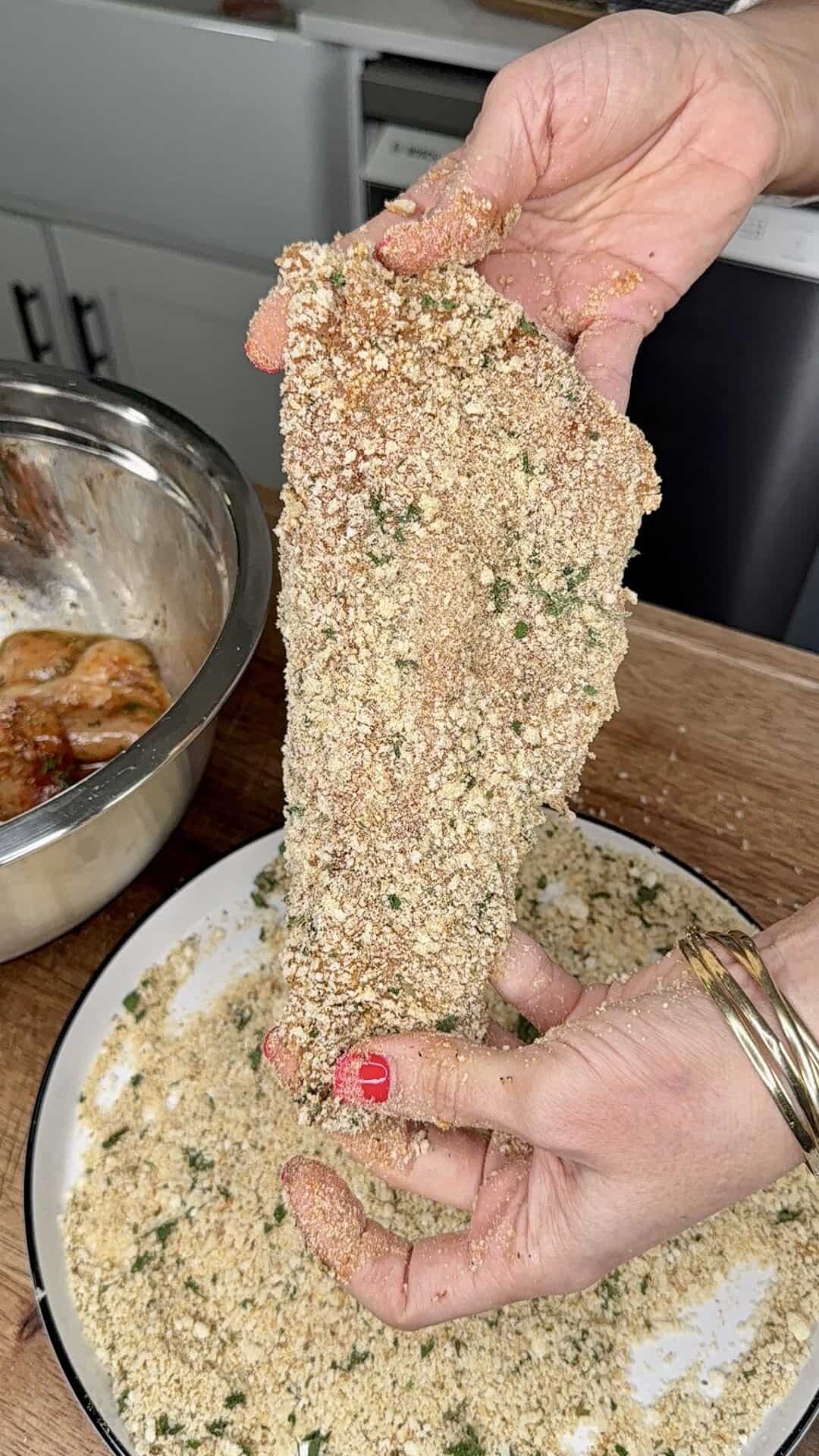 - In another bowl, combine panko, Italian breadcrumbs, and Pecorino Romano cheese, salt, pepper, parsley. Mix with your hands.