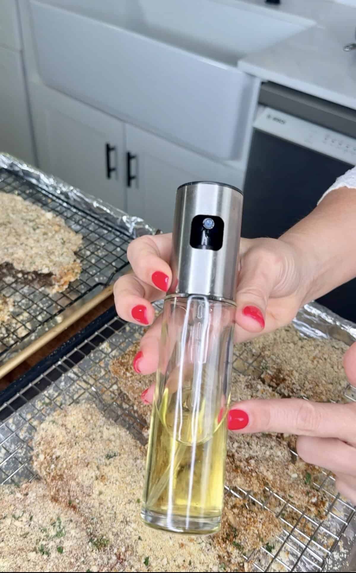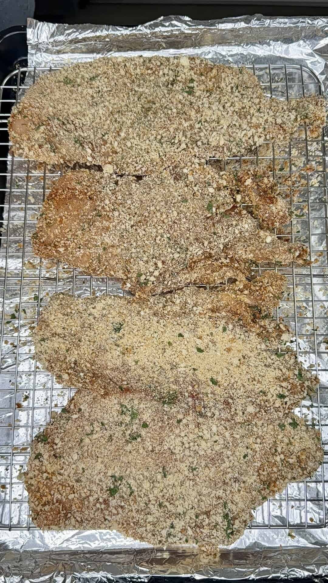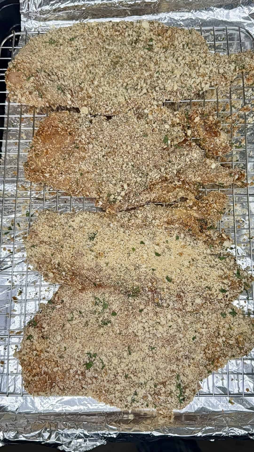 - Place coated cutlets on the prepared baking rack. Spray tops with olive oil spray generously and evenly