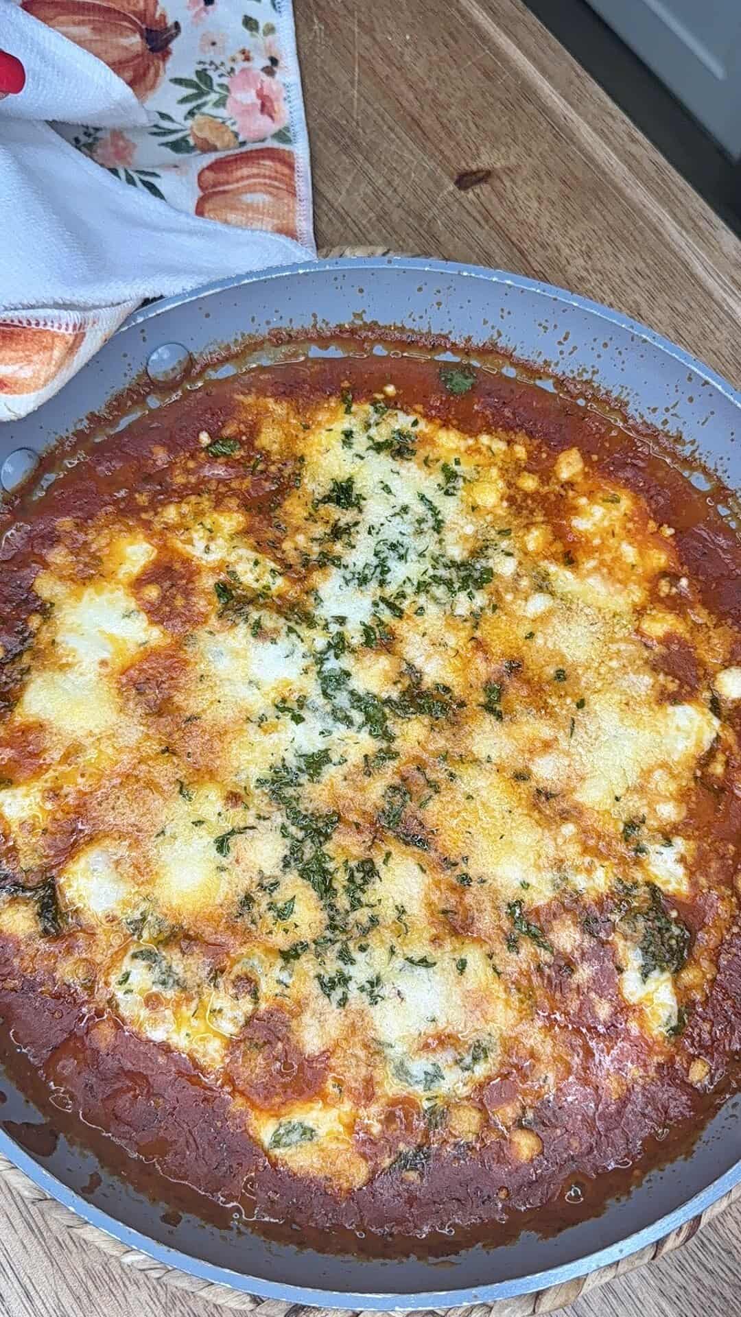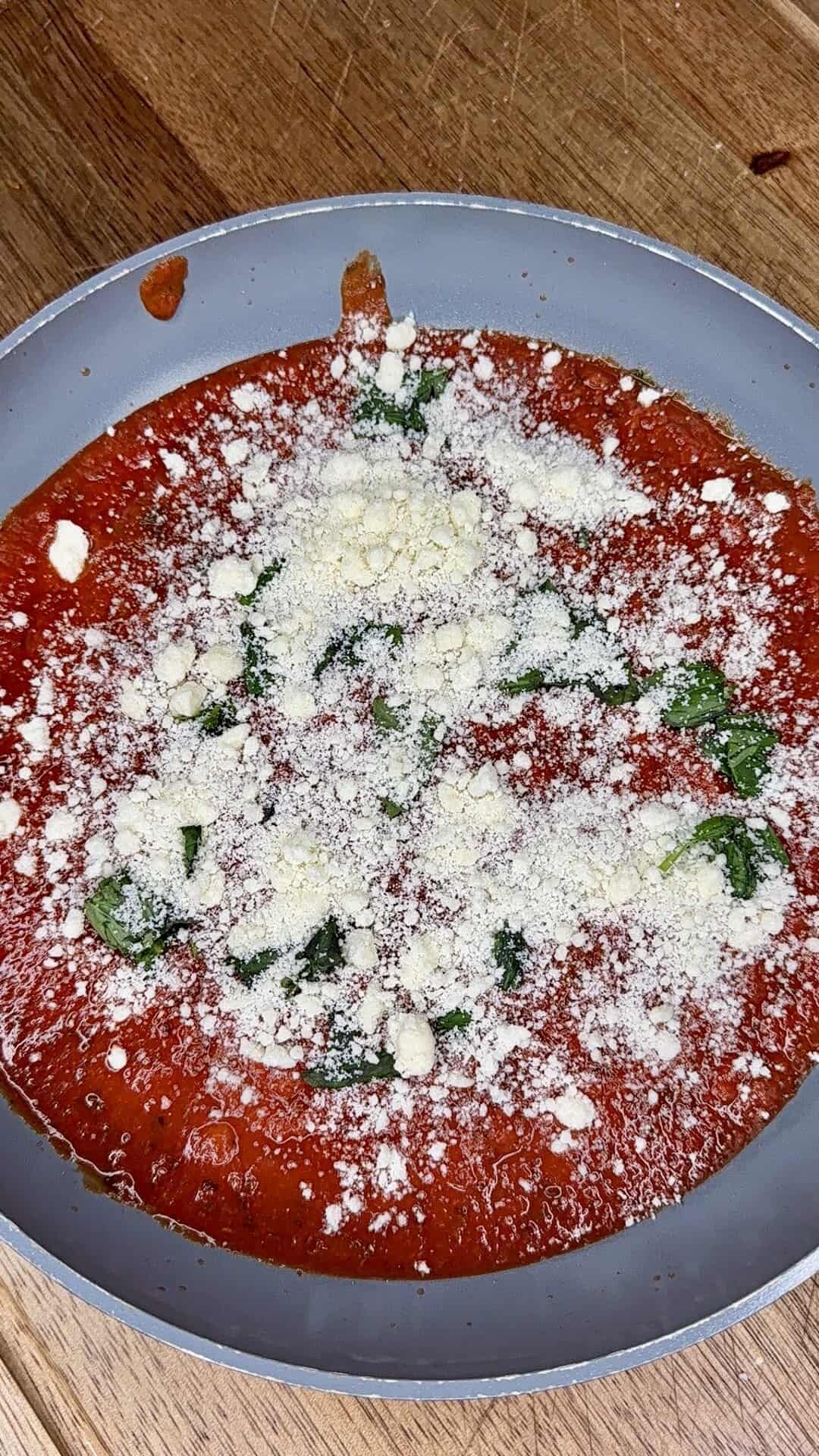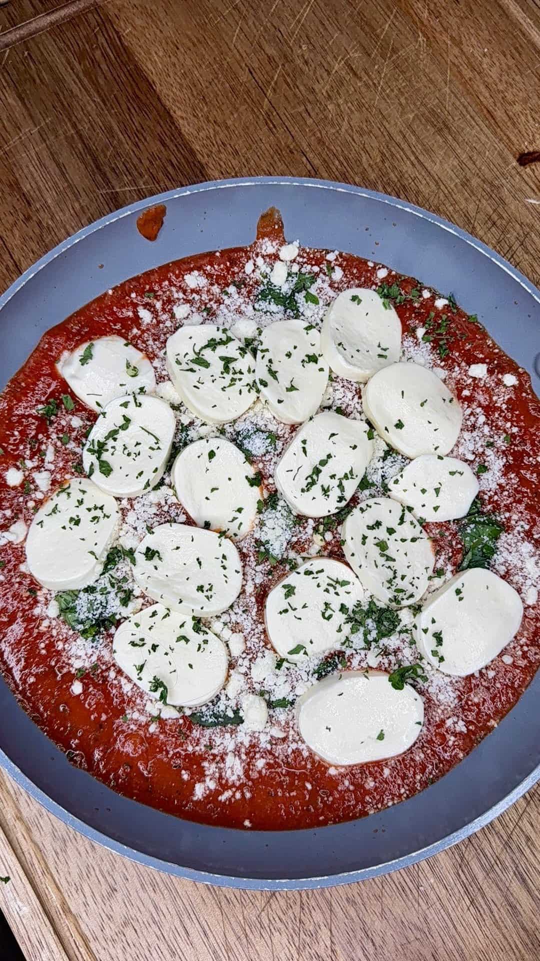 - In an oven-safe pan, pour in the marinara sauce. Sprinkle Pecorino Romano over it and torn up basil leaves, then layer fresh mozzarella slices and a sprinkle of chopped parsley.