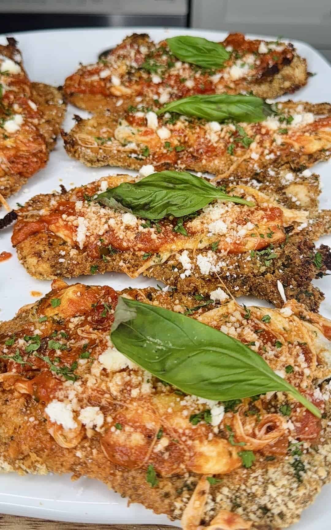 - Add the crispy baked chicken cutlets to a serving dish and spoon the hot cheesy sauce over top.
