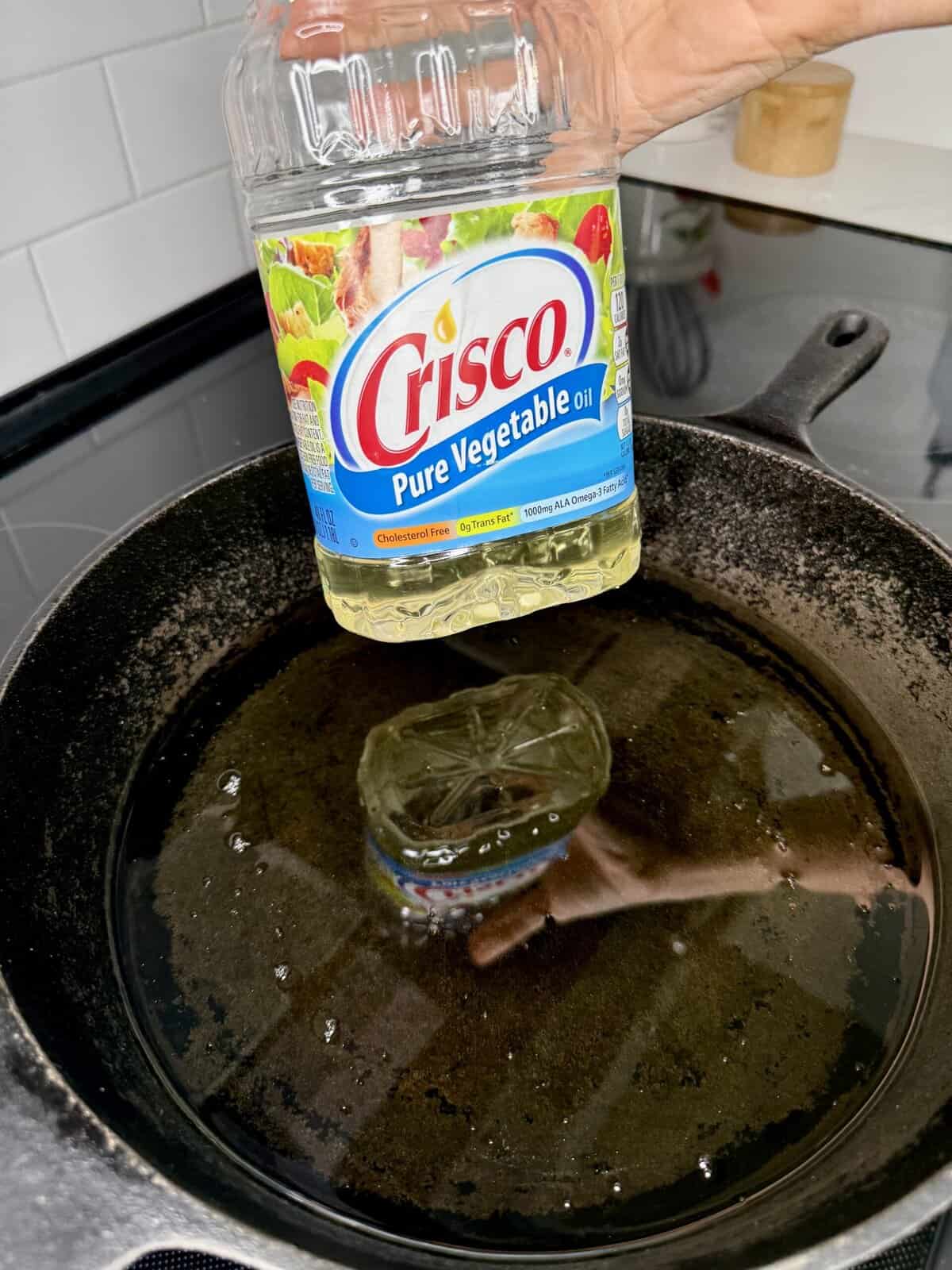 - Pour about 1 inch of oil (~30 oz) into a cast-iron skillet or heavy-bottomed pan. Heat over medium-high until it reaches 350°F (or until a pinch of flour sizzles when added).