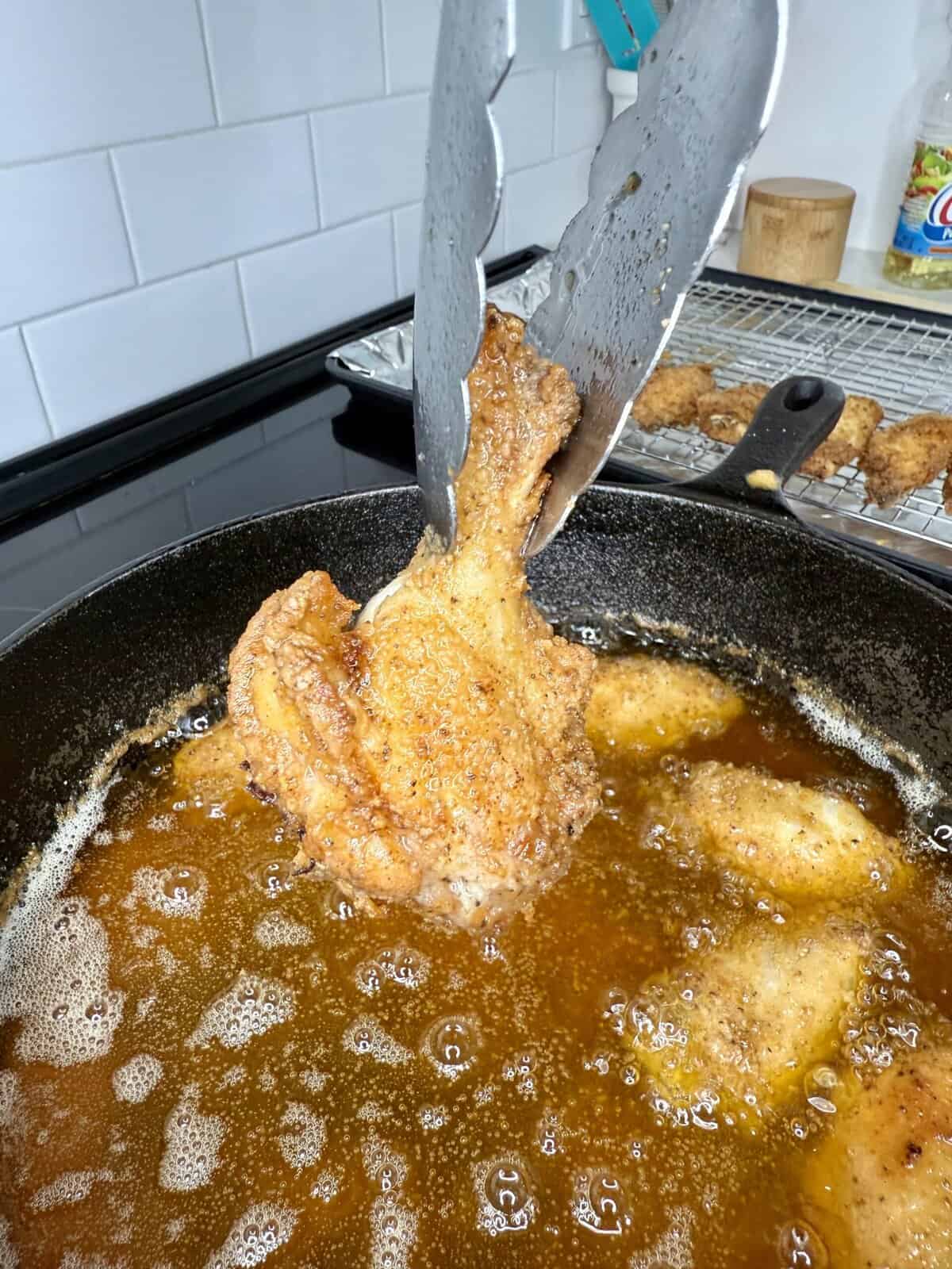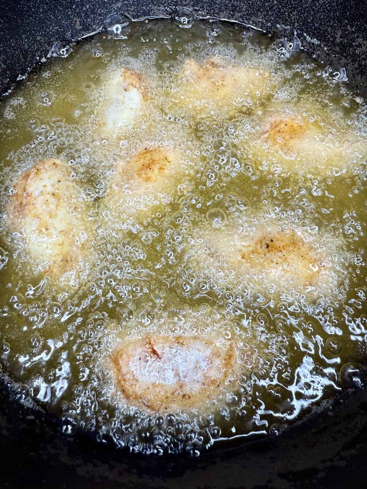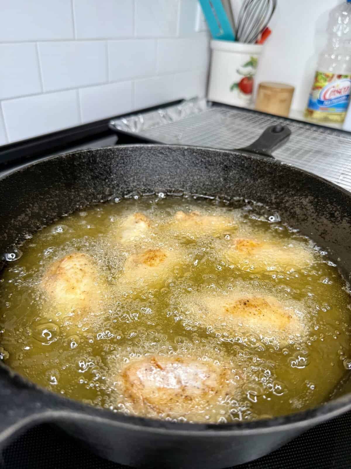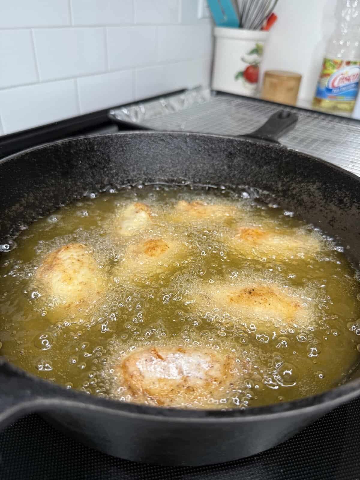 - Work in batches and don’t overcrowd the pan. Fry each batch for 8–10 minutes, flipping halfway through, until golden brown and internal temp hits 165°F.