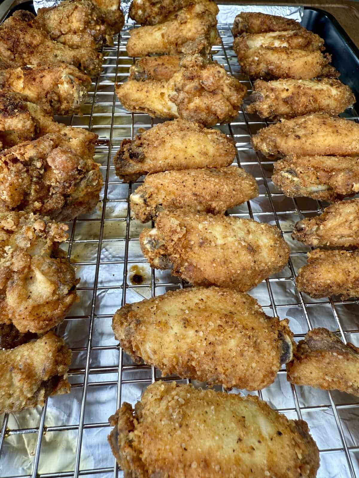 - Transfer fried wings to a cooling rack set over a baking sheet to drain.