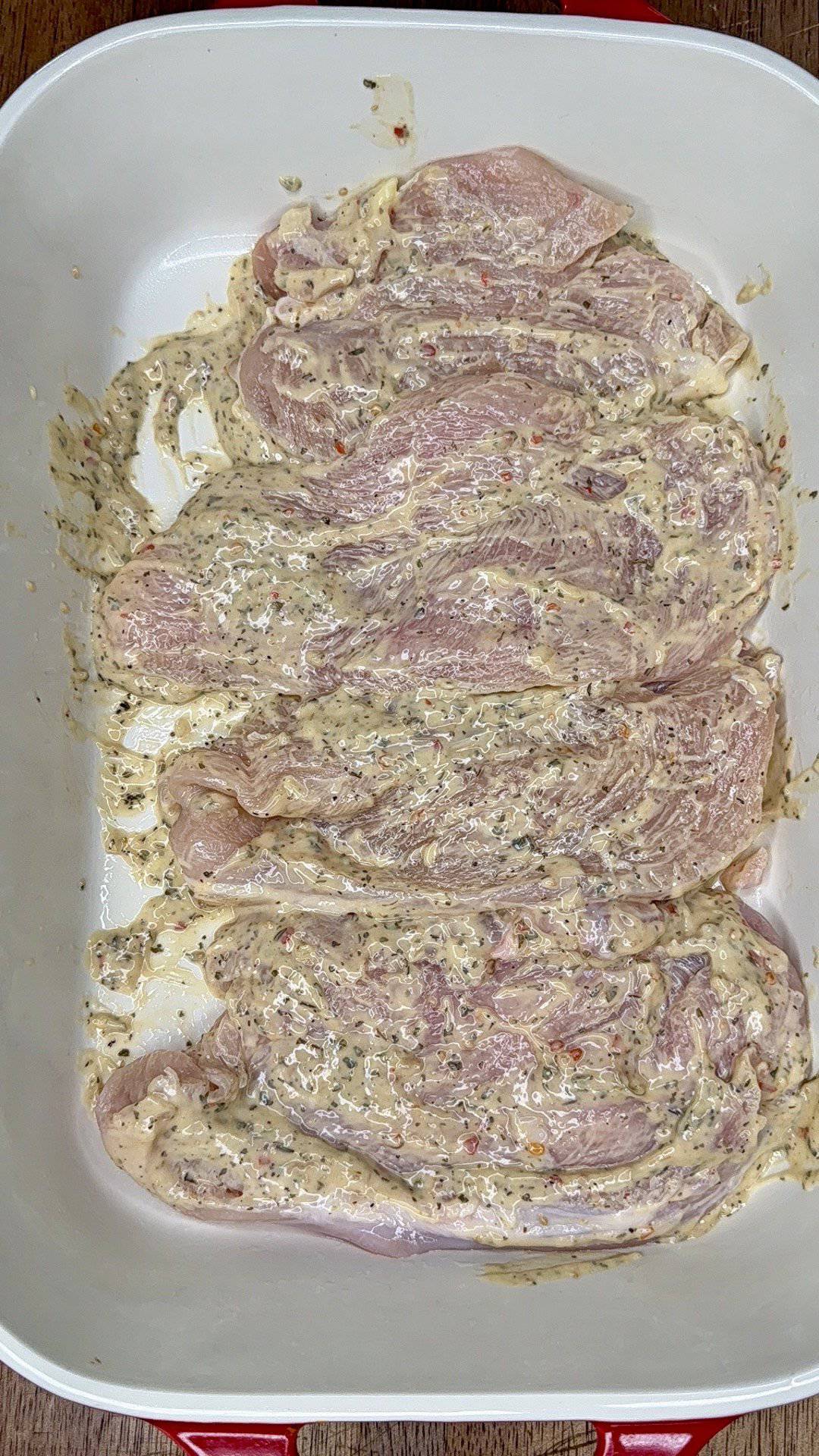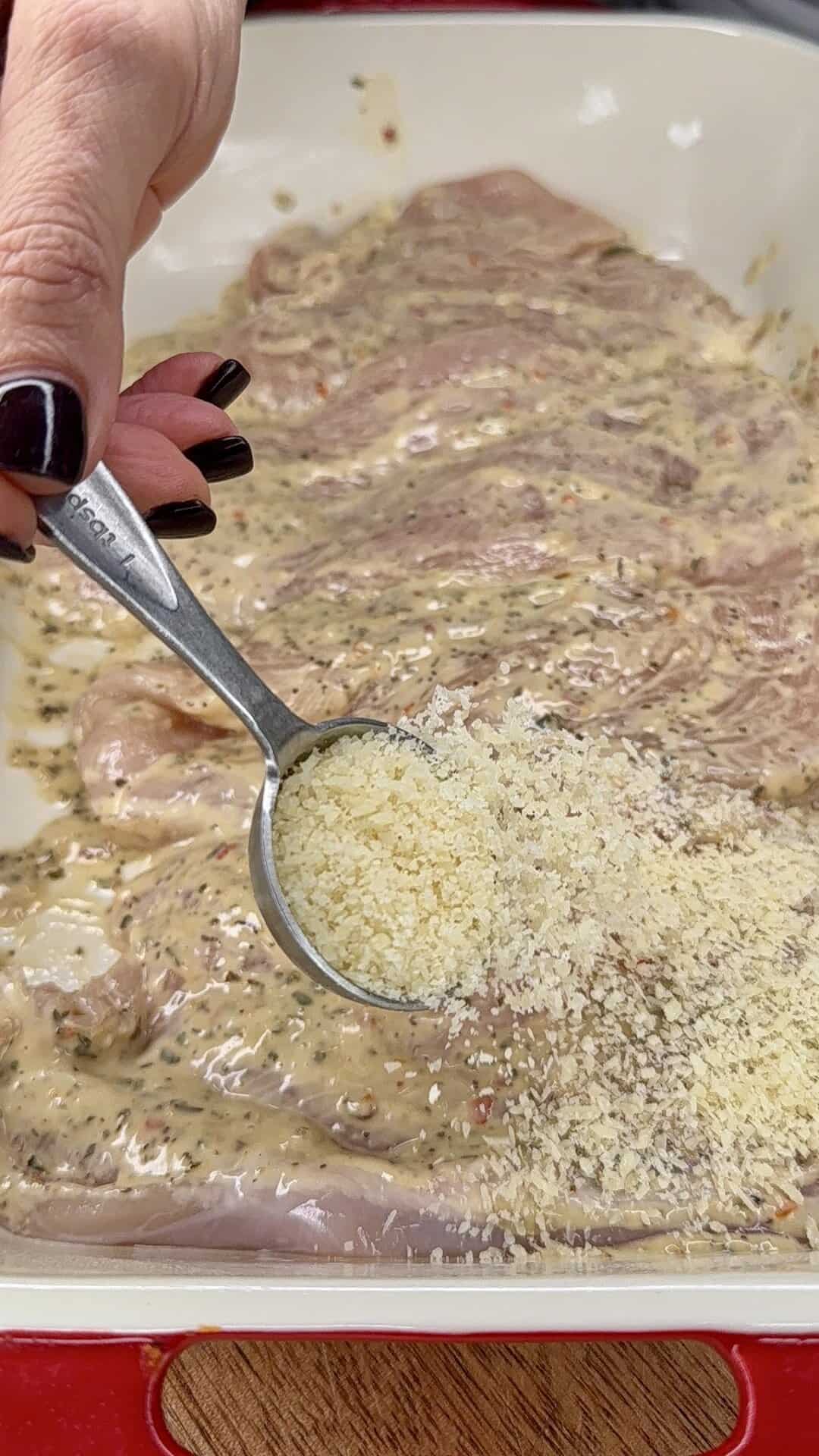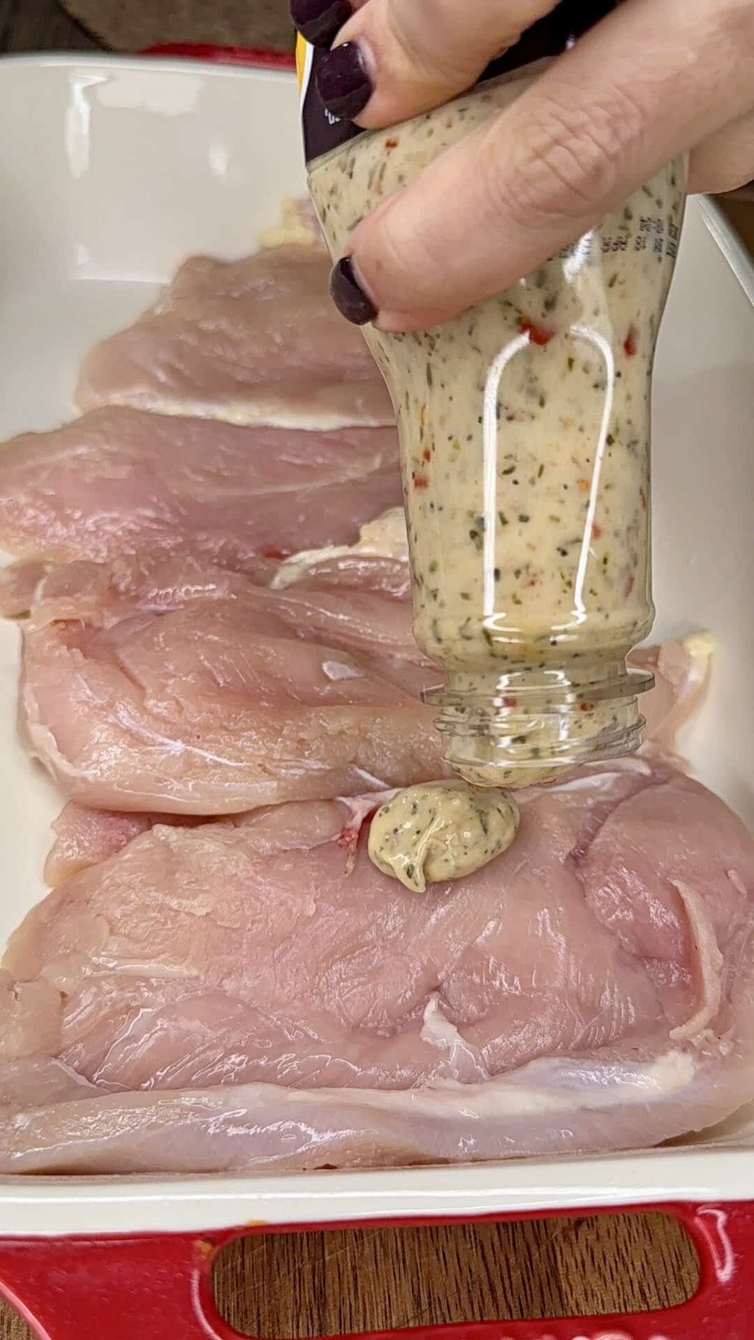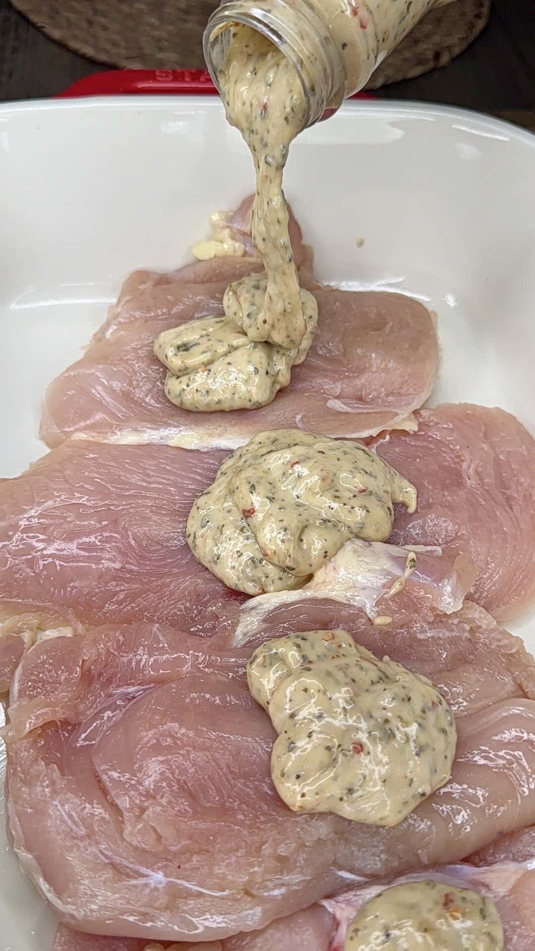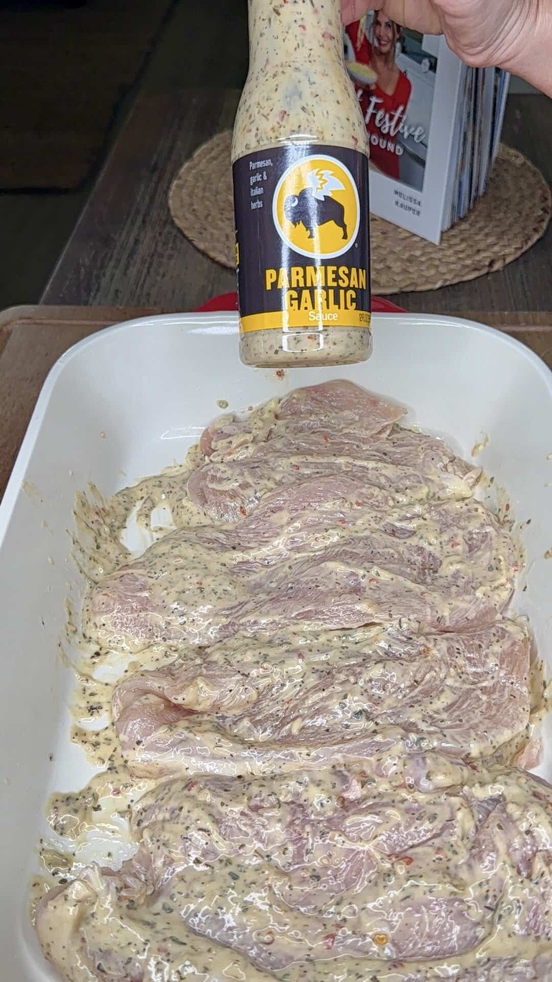 - Coat the chicken: Pour a little Parmesan Garlic sauce into the baking dish. Dip each cutlet into the sauce to coat both sides, then lay them in the pan. Pour the rest of the sauce evenly over the chicken.