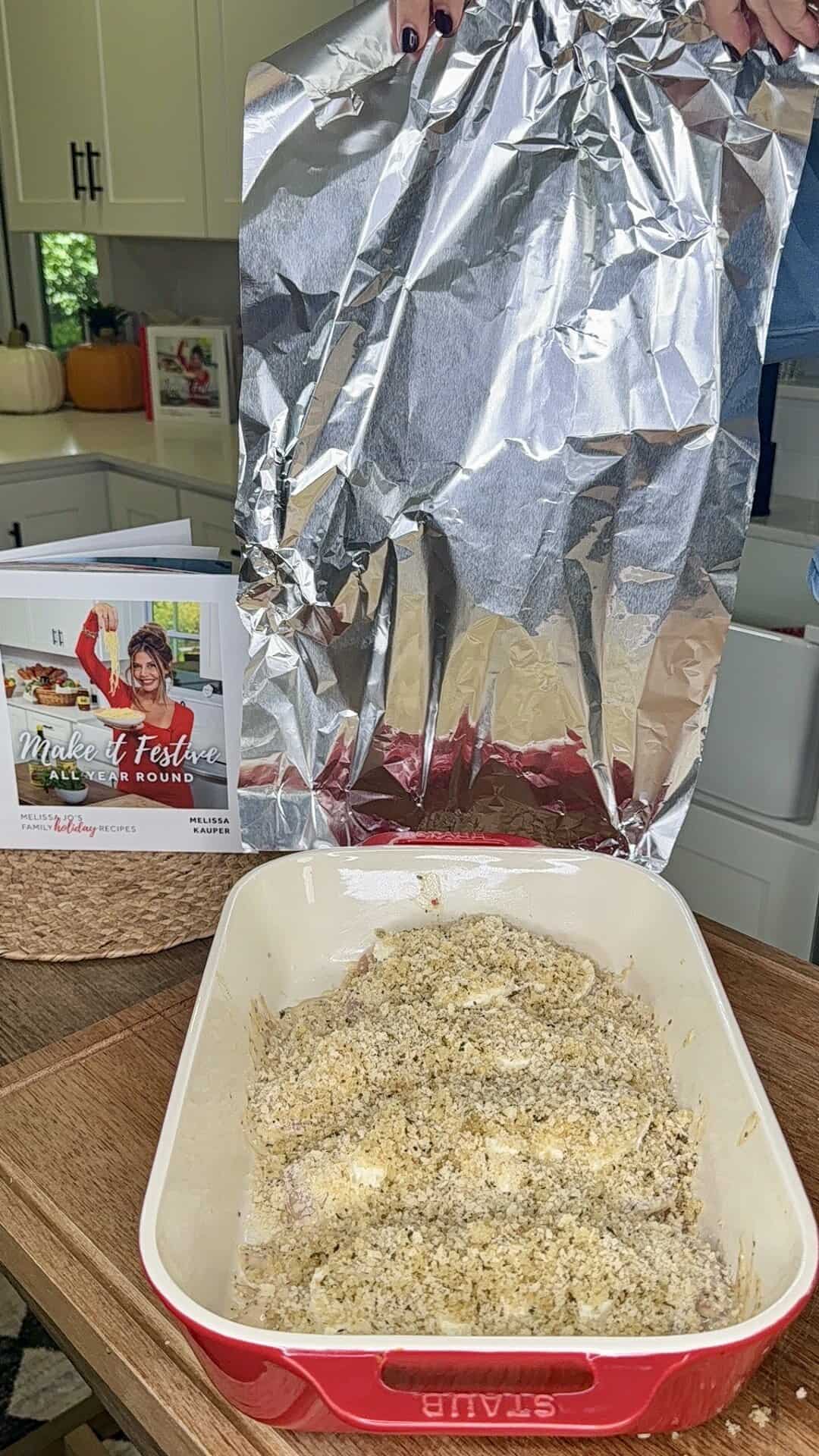 - Baking it covered first helps everything cook through, and uncovering at the end gives you that golden, bubbly top.