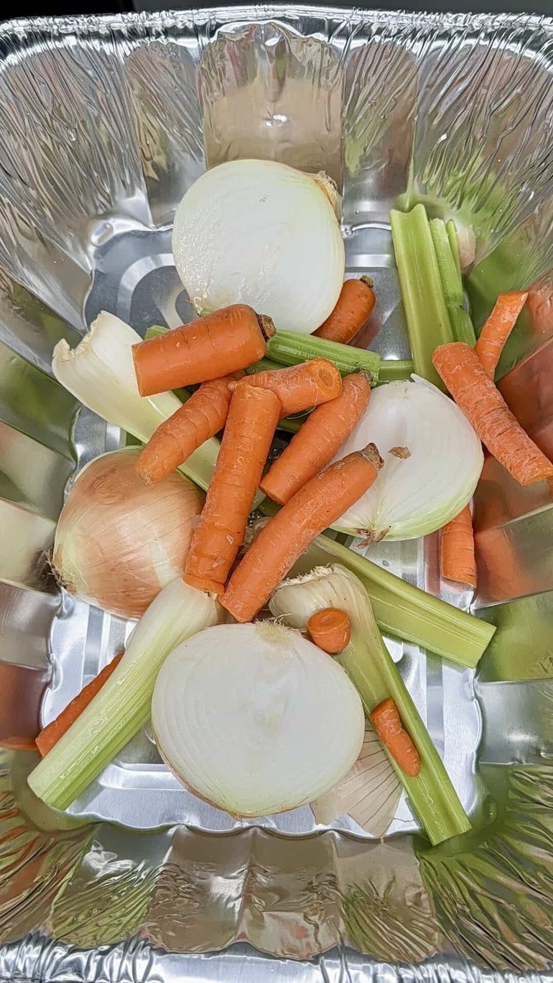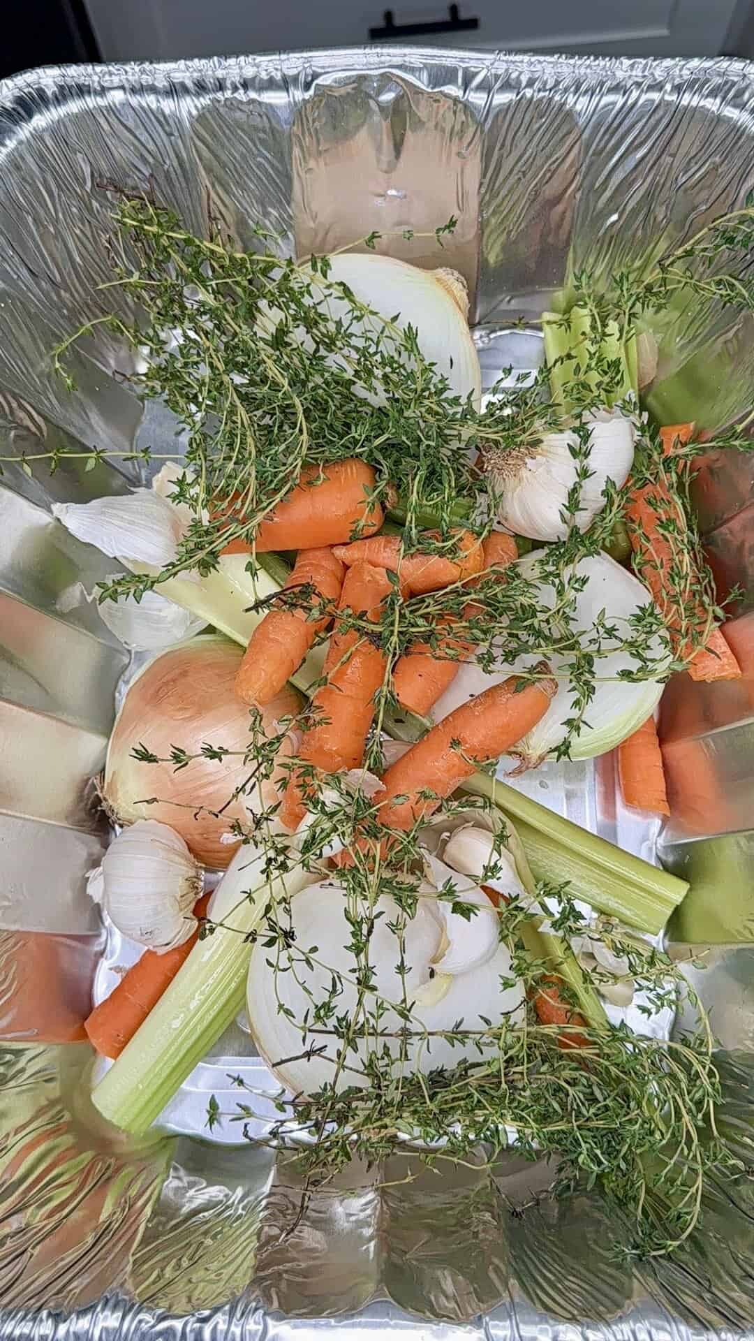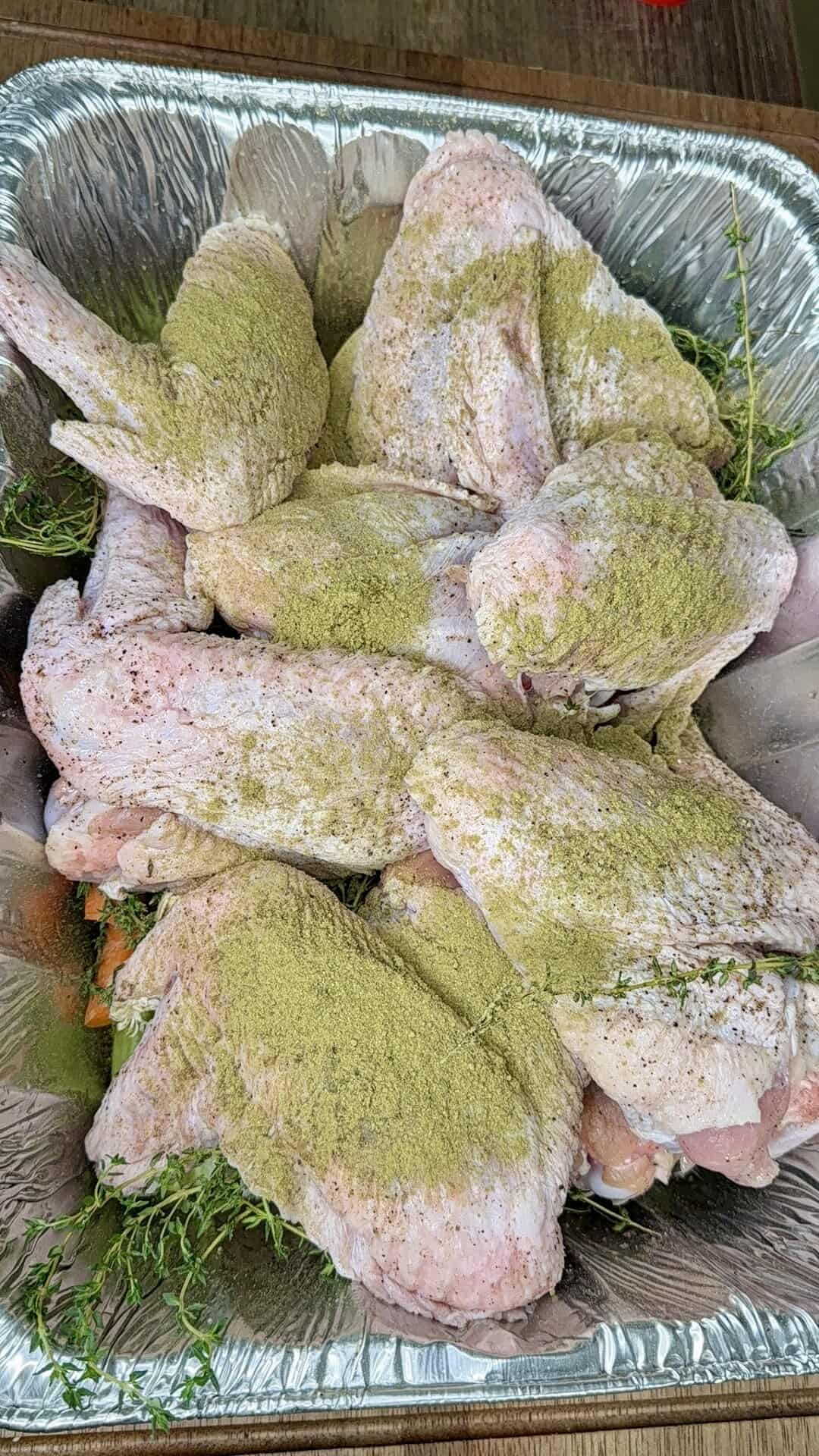 - In a large roasting pan, combine turkey wings, onions, celery, carrots, garlic, and thyme.