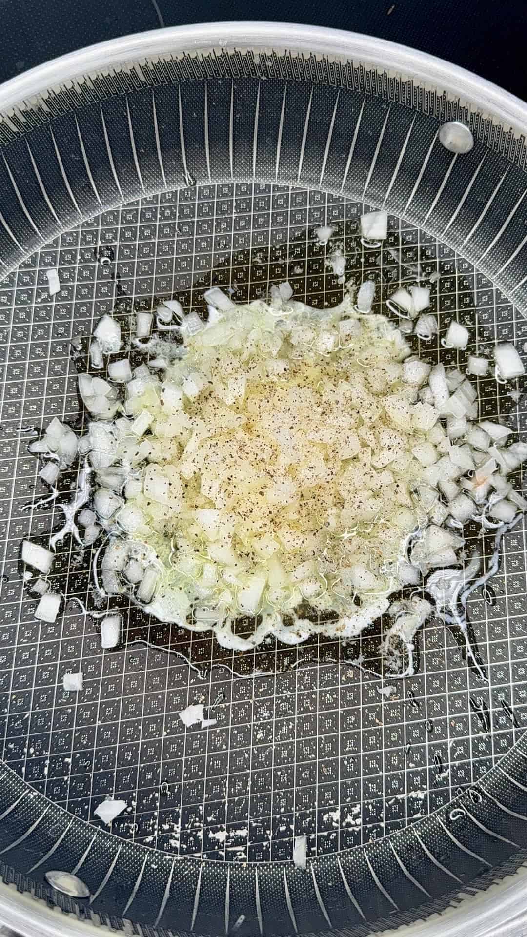 - Add diced onion and a pinch of salt and pepper; sauté until translucent.