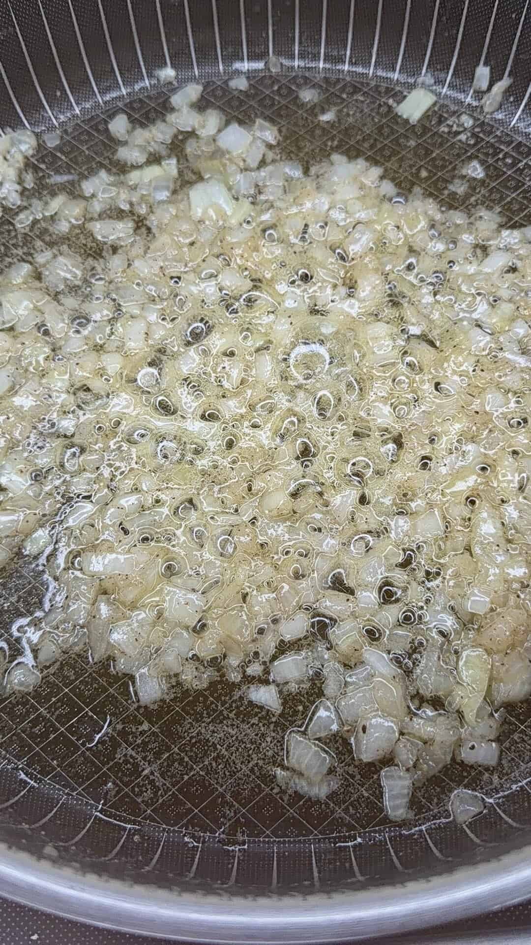 - Add the diced onion and sauté until translucent only — not browned.
