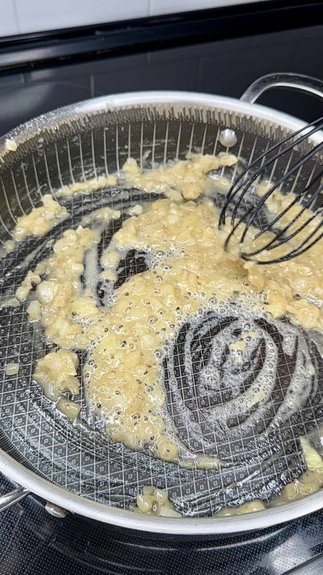 - Sprinkle in the flour and whisk continuously to form a smooth roux, keeping the heat medium-low.