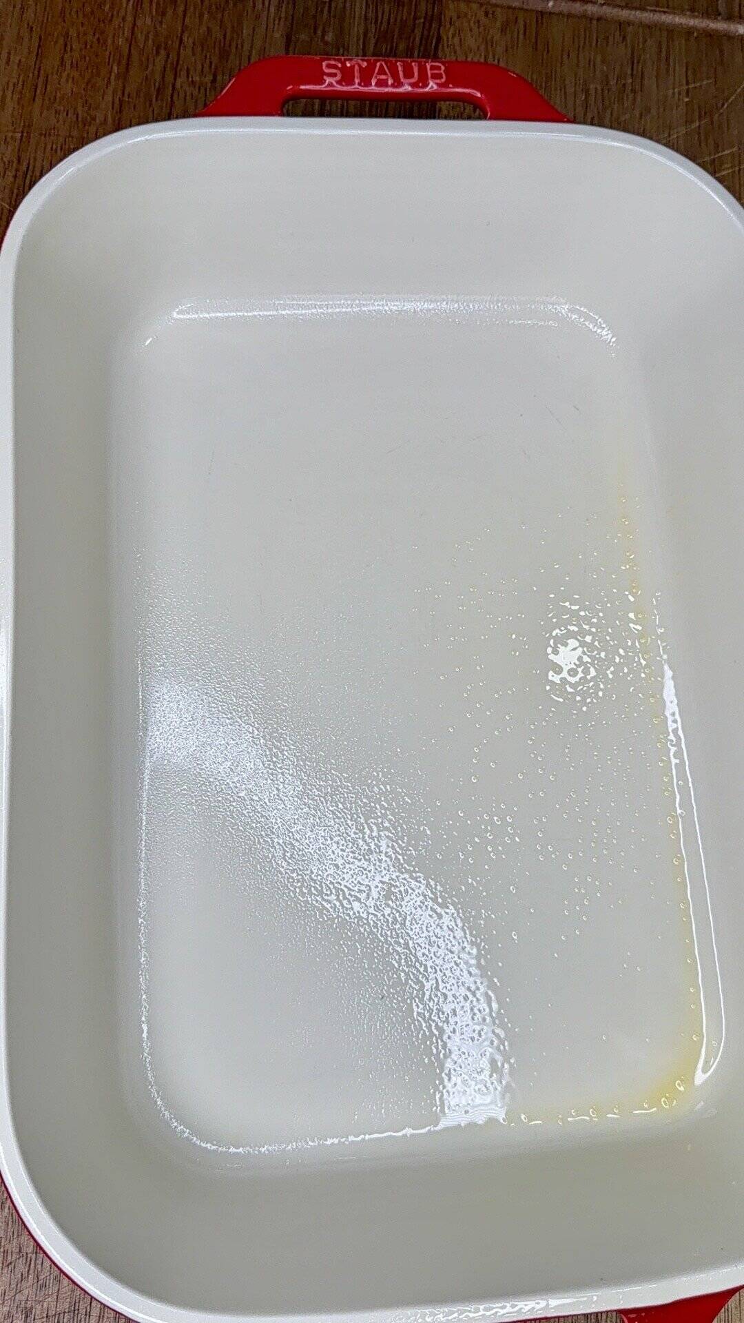 - Grease a 9×13 baking dish.